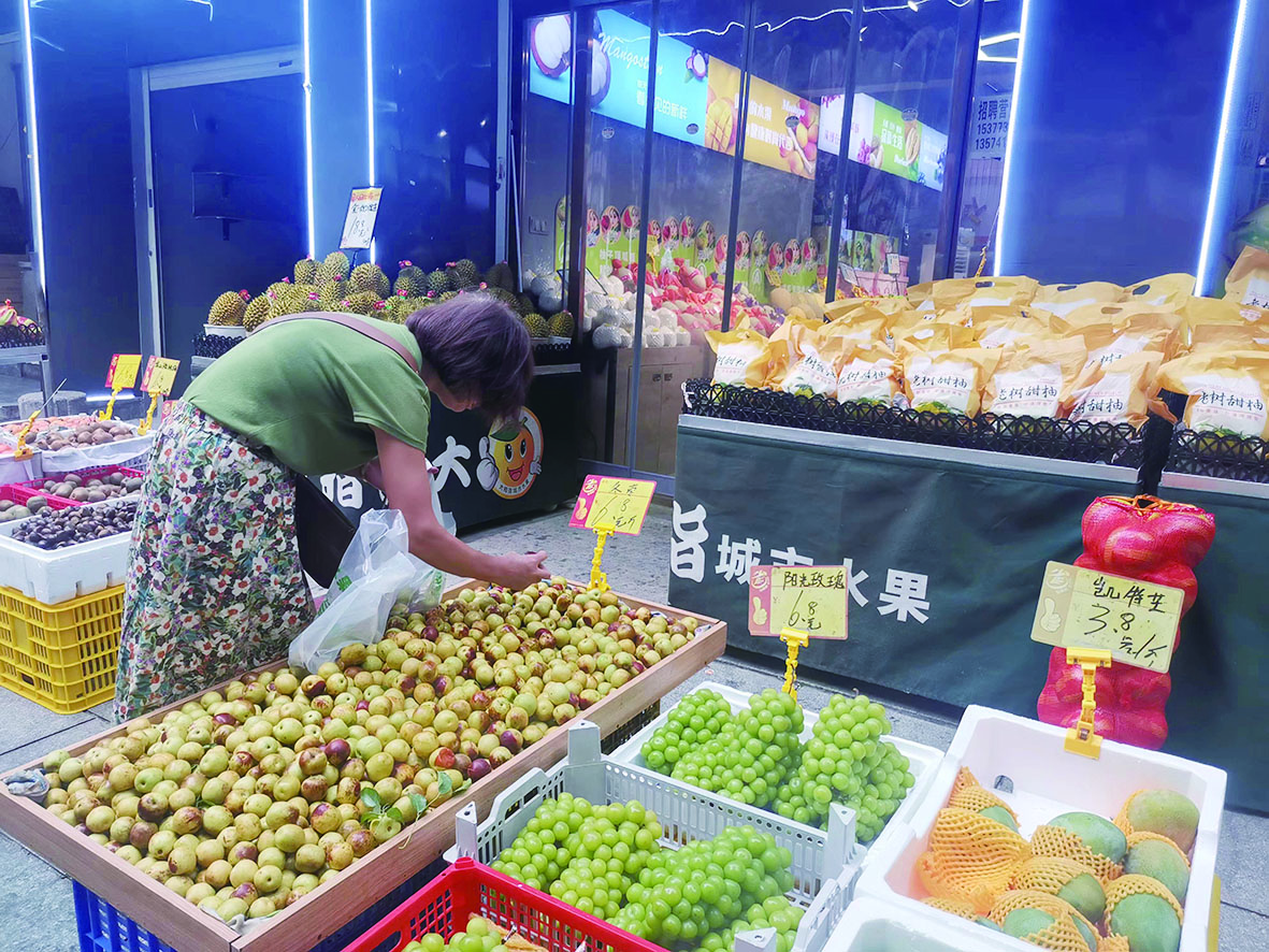 天元区新闻路一家水果店门口,顾客在选购水果。 记者/罗春娇 摄