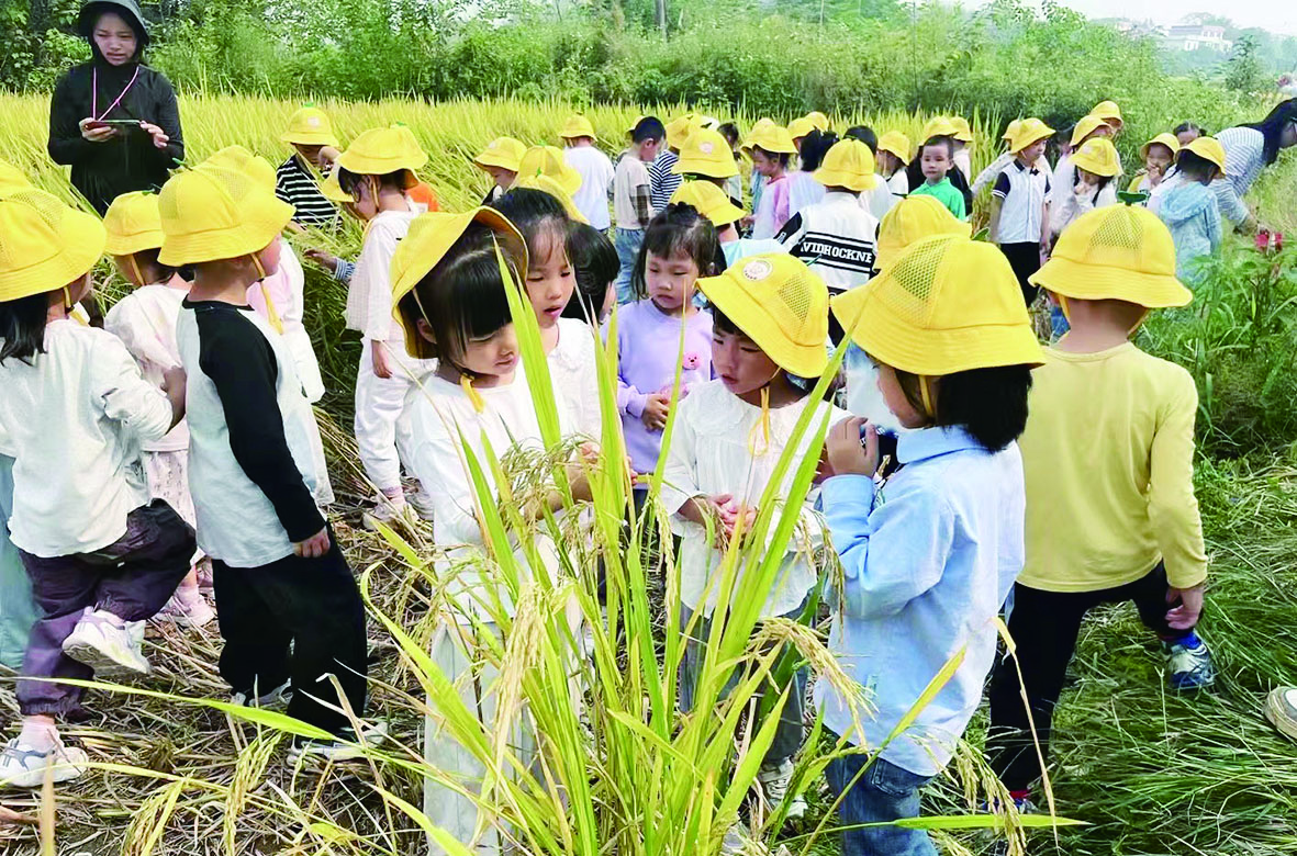 孩童们不亦乐乎地穿梭在稻田中,割稻谷、扎稻草人、学习水稻知识,还一起观看大型收割机现场收割水稻的场景,在劳作中体悟“粒粒皆辛苦”的深意,在实践中感受丰收的快乐。