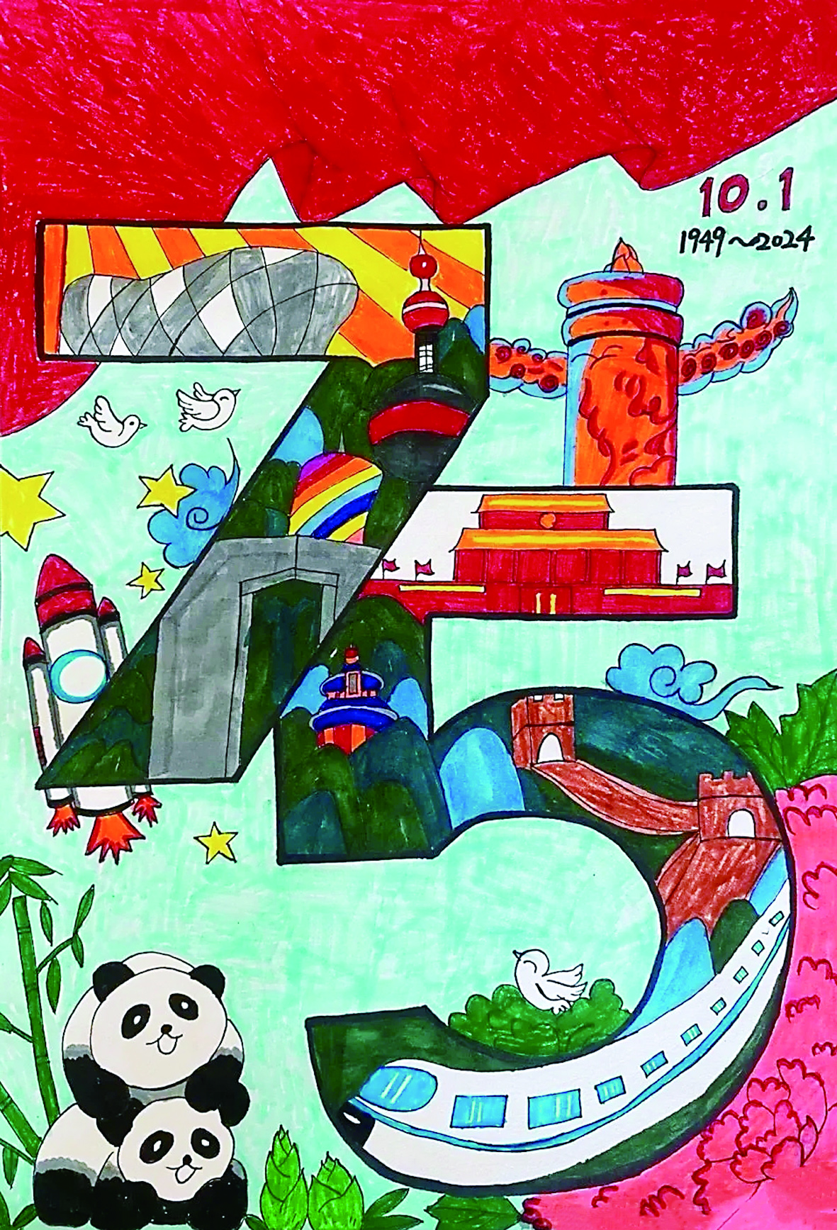 紧接着,活动的高潮来临——我们共同绘制百米长卷,用画笔描绘盛世,共筑梦想。画布缓缓铺展,宛如一条承载希望的长河,等待着我们挥洒创意。小记者们手持彩笔,或蹲或立,眼神专注,每一笔每一划都倾注了对祖国的深情与祝愿。有的绘制出雄伟的天安门,红旗招展,庄严肃穆;有的则展现繁华都市的景象,高楼林立,车水马龙;还有的细致勾勒出壮丽山河,绿水青山,美轮美奂。我们仿佛成了小小的艺术家,用色彩编织着属于我们的中国梦。这幅百米长卷,不只是画作,更是我们对祖国美好未来的共同向往与期盼。