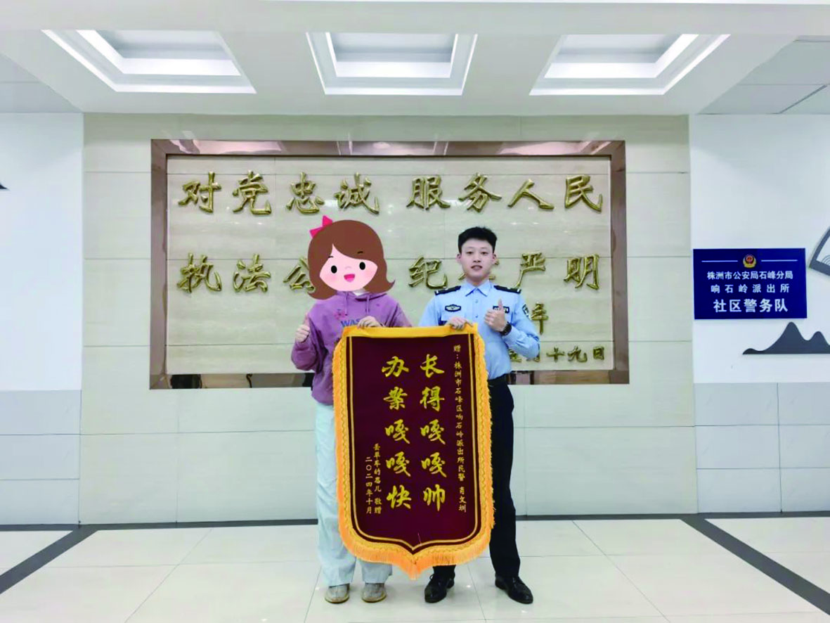本报讯(株洲晚报融媒体记者/沈全华 通讯员/王斐妮) “谢谢警官帮我找回了自行车!”近日,石峰区群众黄女士将一面写有“长得嘎嘎帅 破案嘎嘎快”两行大字的锦旗送至市公安局石峰分局响石岭派出所表示衷心感谢。