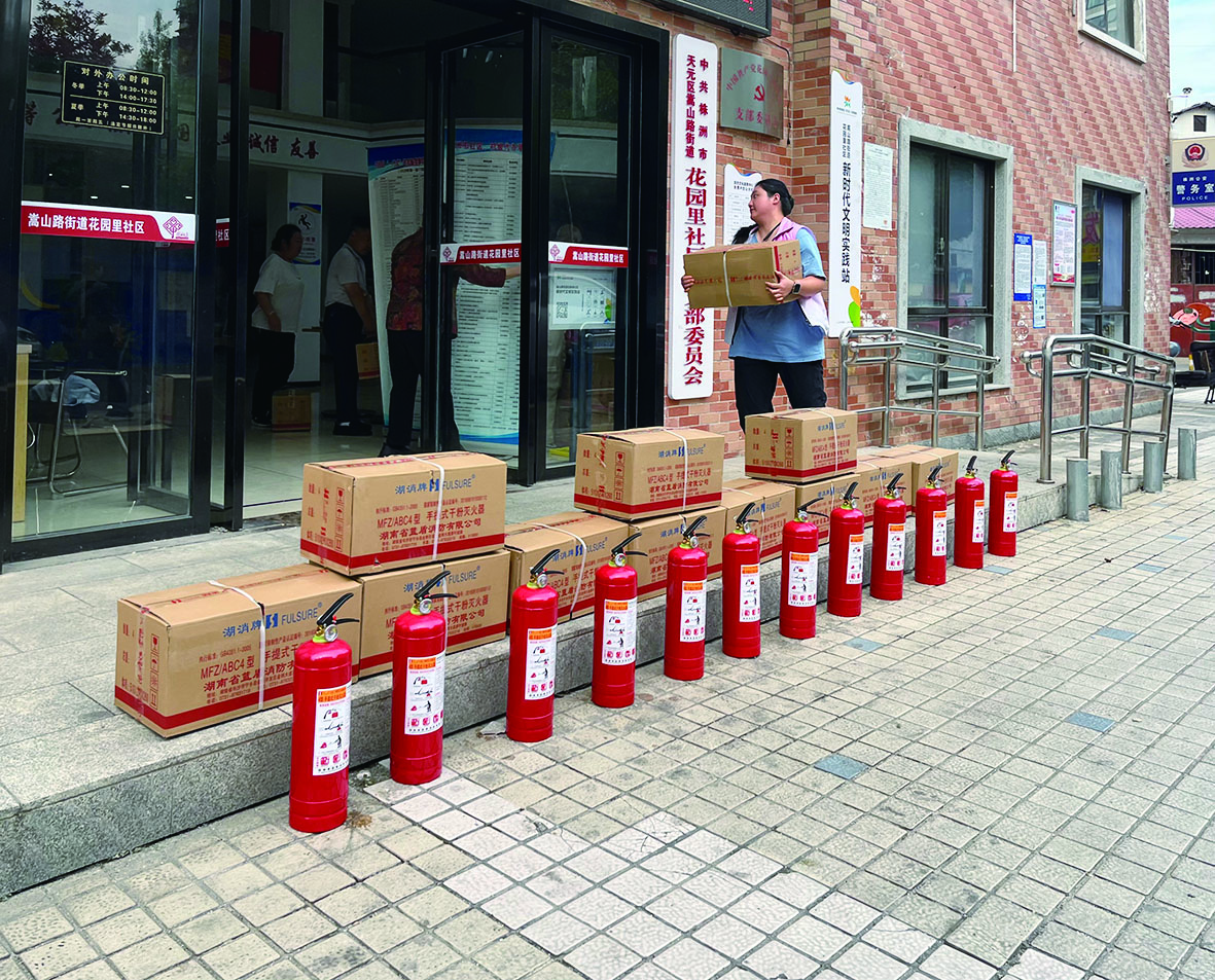 10月12日,天元区嵩山路街道花园里社区居委会,举行灭火器捐赠仪式。经株洲高新区动力谷创新创业服务中心花园二村工作队牵线搭桥,湖南新恩智能技术有限公司向花园二村小区捐赠了90个灭火器。花园二村小区有居民楼50多栋,很多建于上世纪80年代,存在消防设施不完善、消防器材老化等问题。获捐赠的灭火器将用于对居民楼内灭火器进行更换和补充。图为捐赠的灭火器送到了居委会。