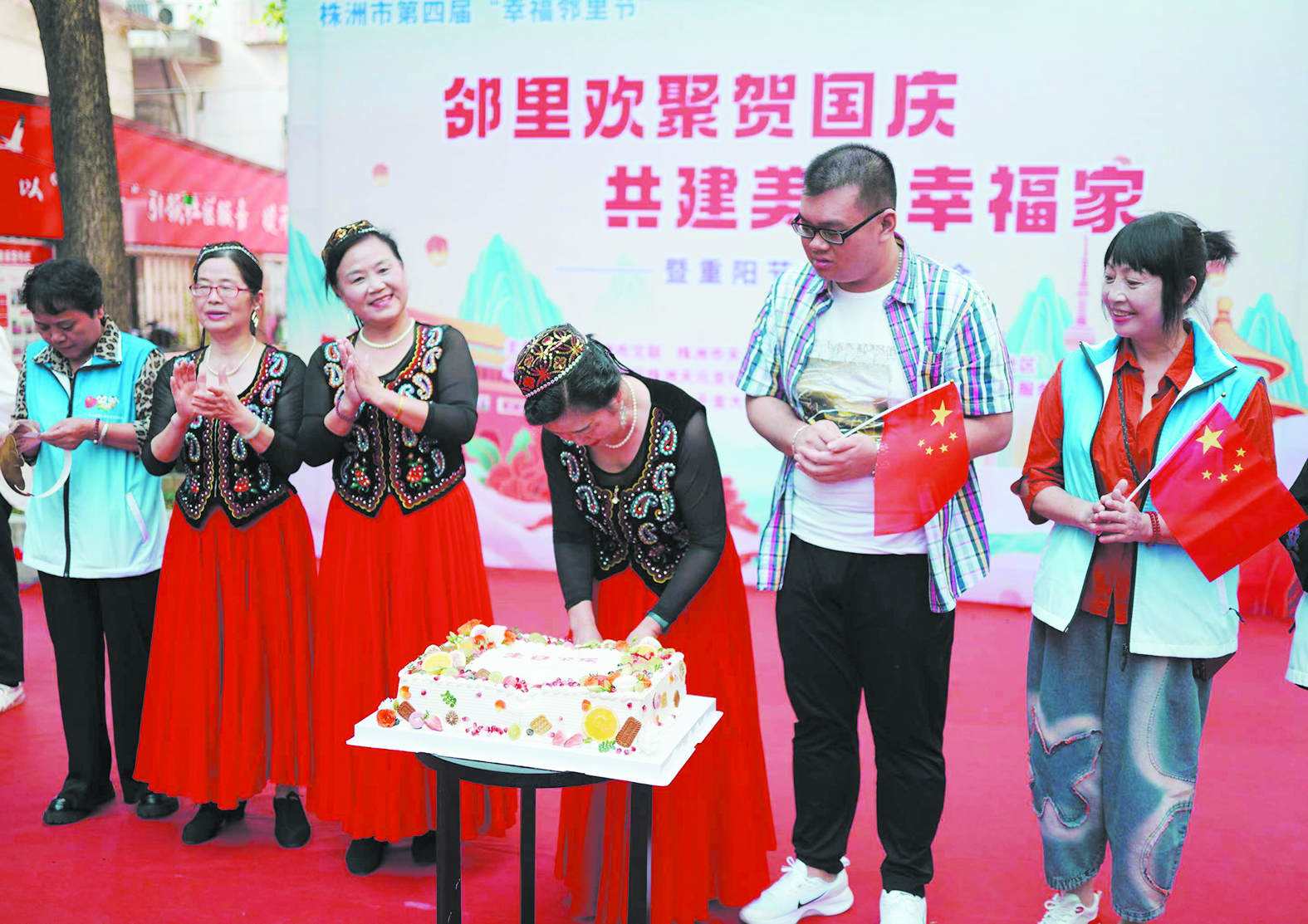 10月11日上午,天元区嵩山路街道白鹤社区居委会前坪一片欢腾。白鹤社区联合市文联、天元区交通运输局等多家单位为凌益洲等8位在10月份过生日的居民举办了特别的九九重阳节“集体生日”会。现场200多人为寿星们献上生日的祝福。图为寿星在切生日蛋糕。