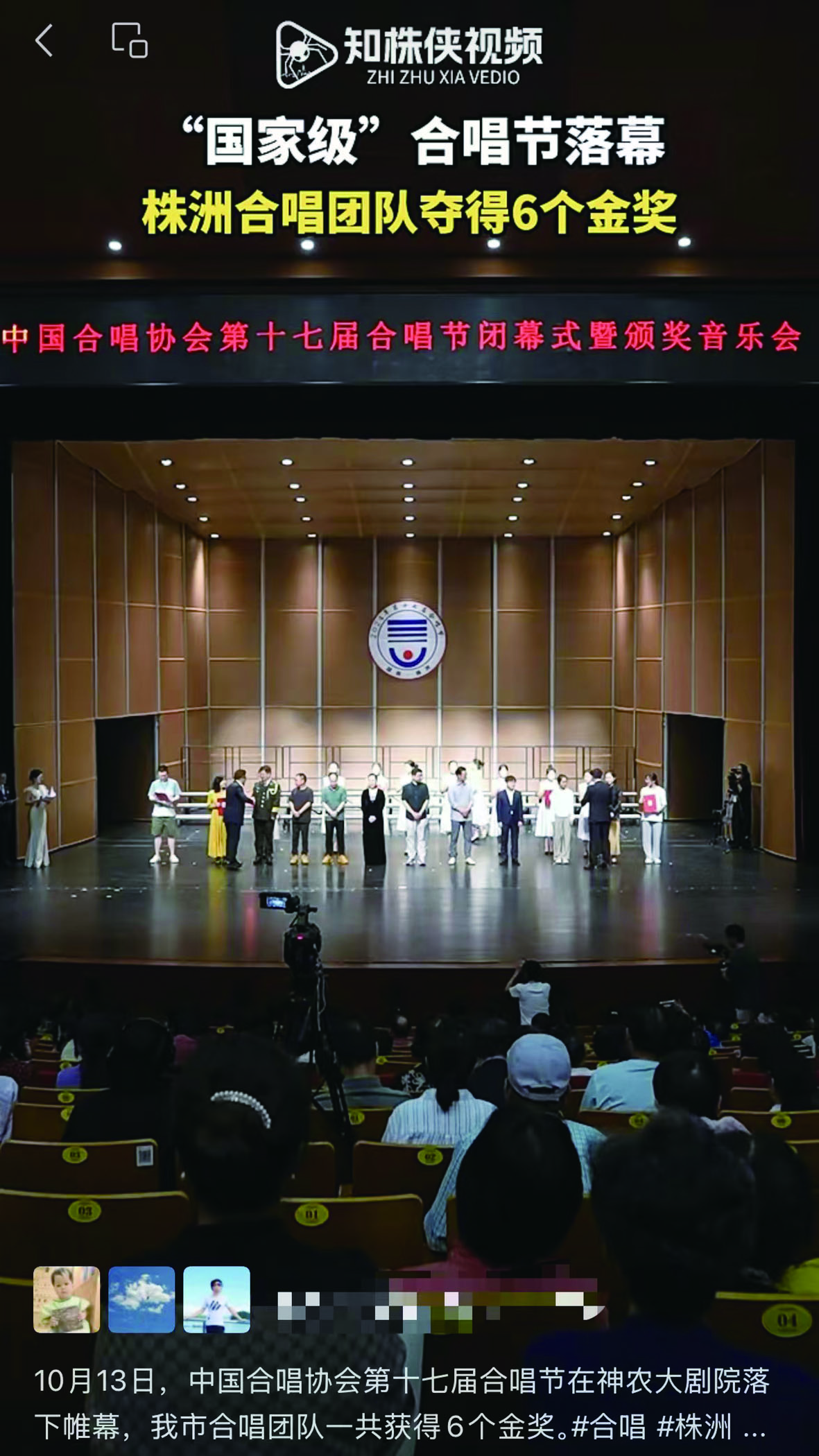 10月13日,中国合唱协会第十七届合唱节在神农大剧院落下帷幕,我市合唱团队一共获得6个金奖。
