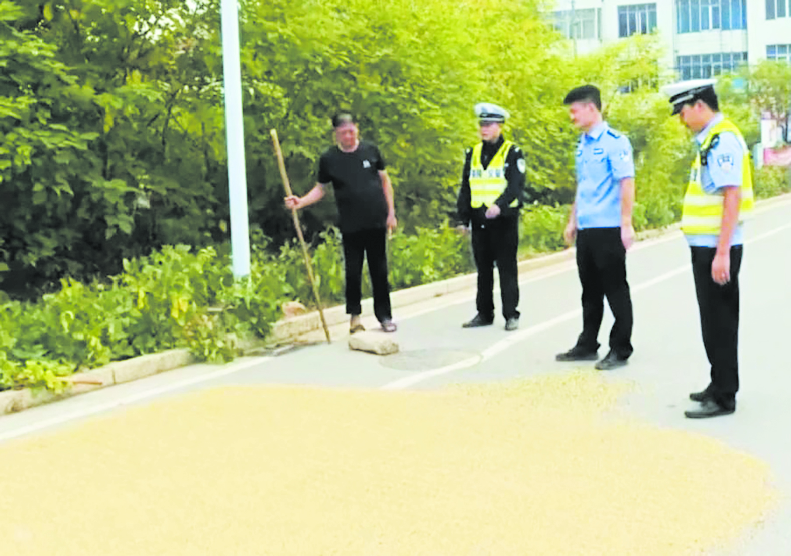 10月14日,在茶陵经开区三期工业园路段,执法人员对违规在公路上晒谷的农户进行劝阻(如图),并宣传相关法律法规政策知识,提高农户安全意识。自秋收以来,茶陵交警共出动执法人员30多人次,清理占道晒粮违法行为10余次,确保群众出行安全畅通。