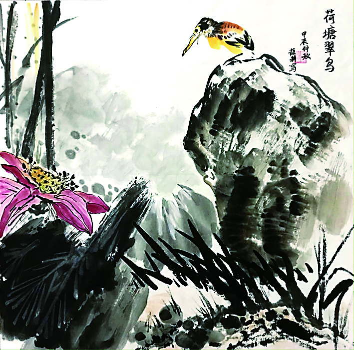 写意画《荷塘翠鸟》 (龚利)