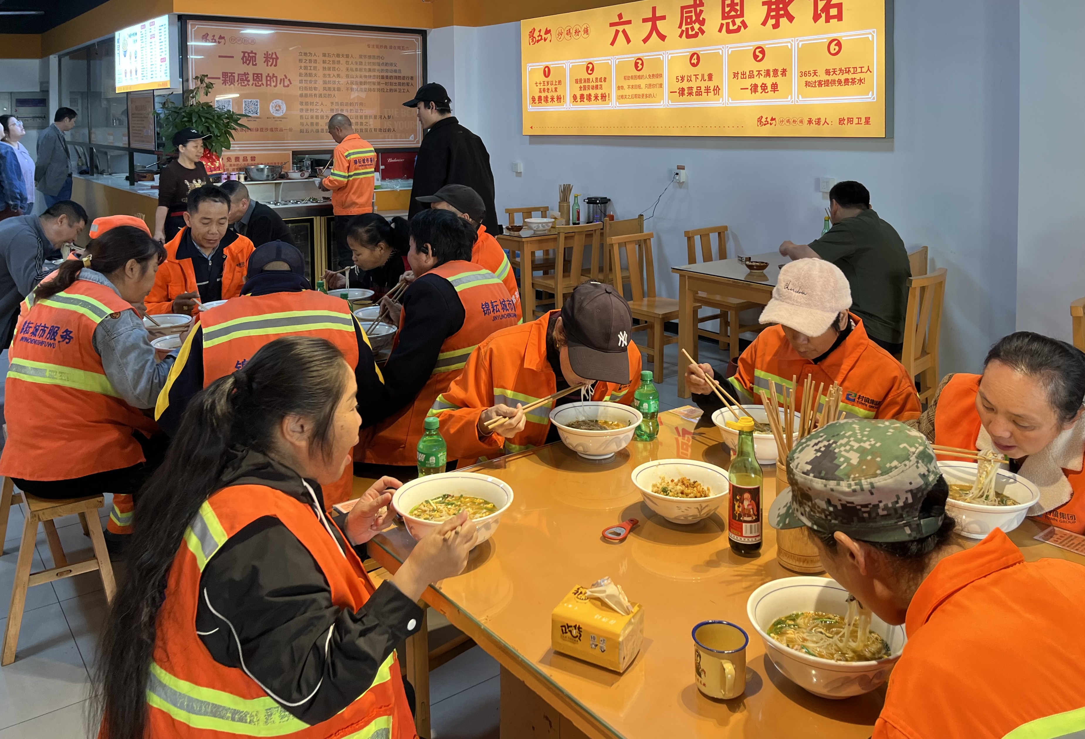 本报讯(株洲晚报融媒体记者/刘平) 株洲有家餐饮店每日请环卫工人嗦粉。10月31日,天元区天伦路,13名环卫工人来到阳五六炒码粉铺免费吃早餐。