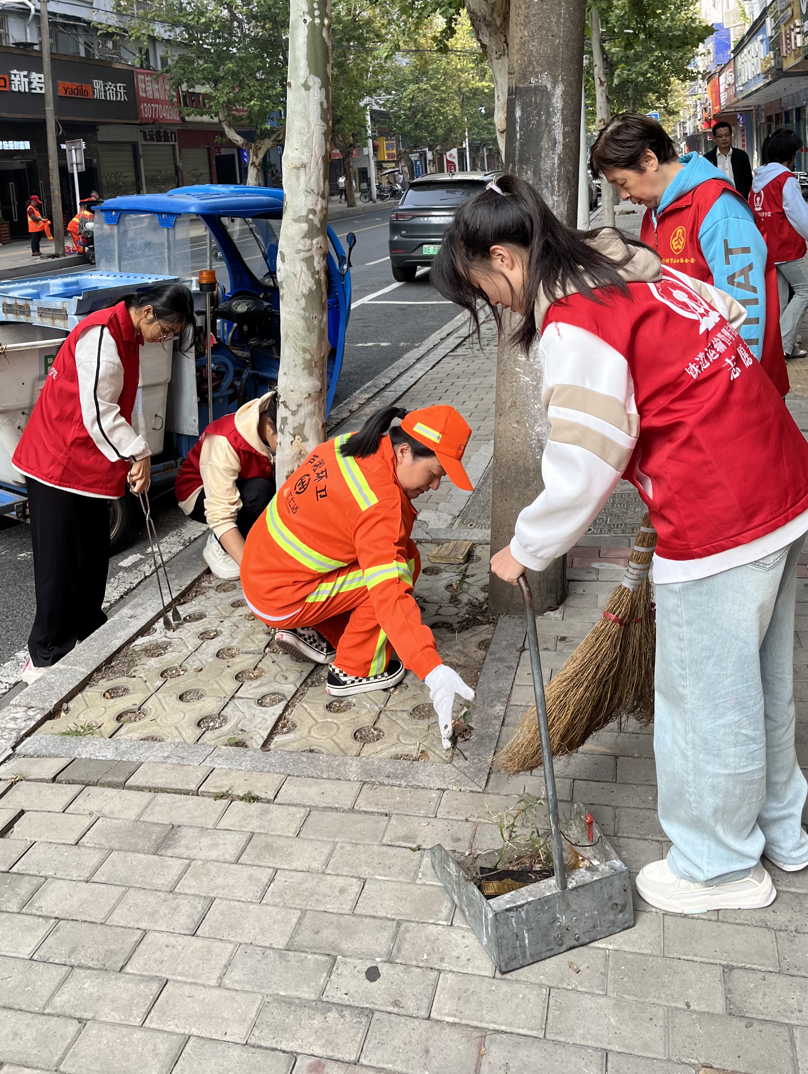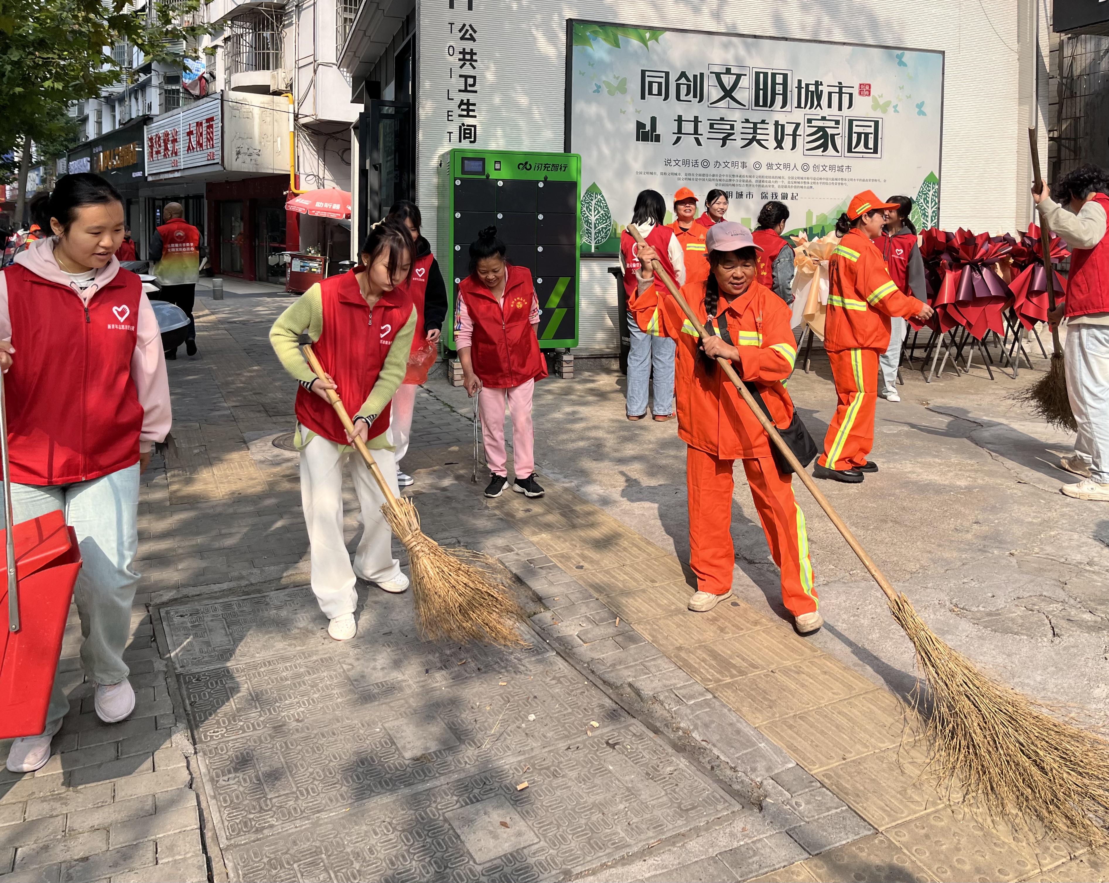 活动中,大学生志愿者在街头体验环卫工人工作,在环卫工人的指导、示范下,拿着扫帚和簸箕清扫大街,吸引不少市民关注。