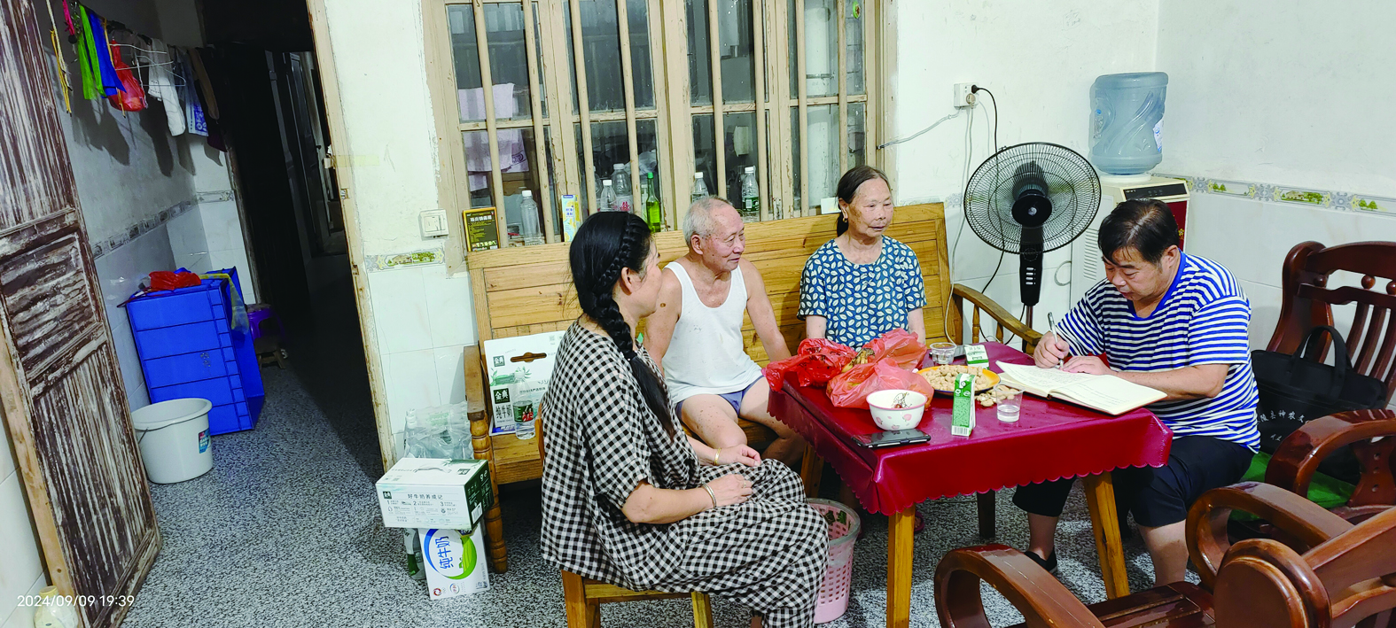 陈丽凡(左1)和婆婆、公公与村里老年人协会相关负责人(右1)交谈。