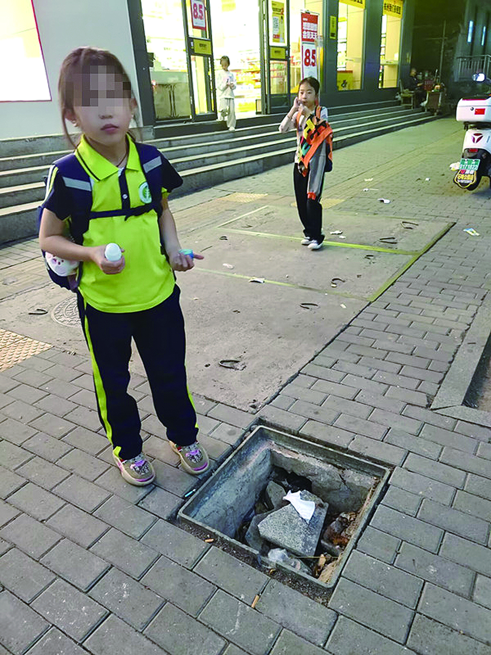 然而,半个月后,情况并未有所改善。11月5日,记者回访时发现井盖依然缺失。周边居民反映,这个坑洞已经存在一个多月,期间已有多位市民不慎踩入坑中。由于该地点靠近杉木塘小学,每天都有大量学生经过,存在安全隐患。居民们呼吁相关部门重视这一问题,并尽快修复井盖,以保障市民和学生的出行安全。