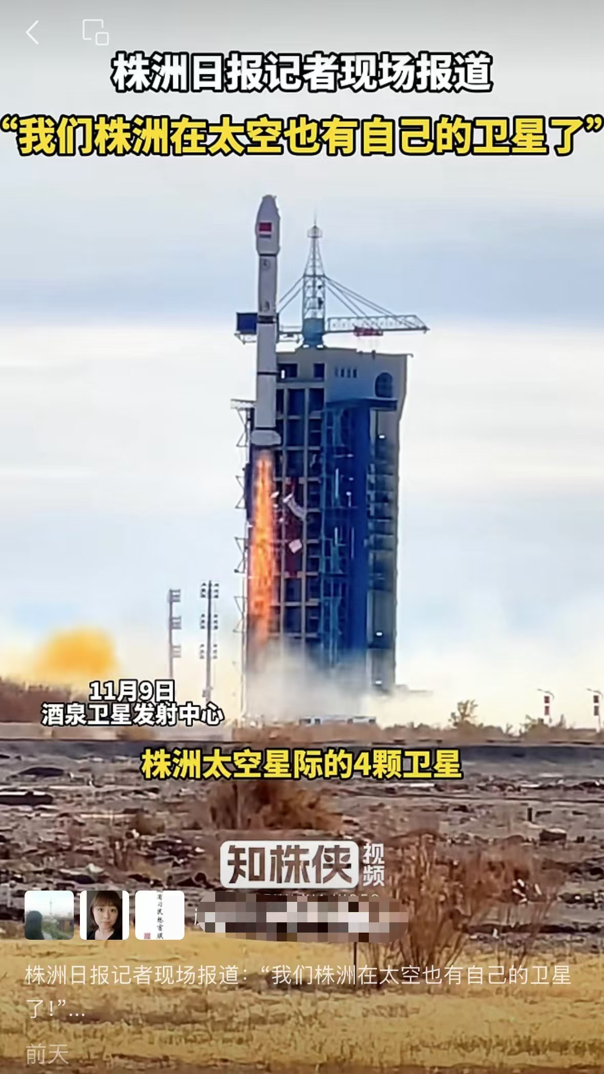 11月9日11时39分,在酒泉卫星发射中心,株洲太空星际卫星科技有限公司投资建设的4颗卫星搭乘长征二号丙运载火箭升空,卫星顺利进入预定轨道,发射任务获得圆满成功。在浩瀚的太空中,株洲拥有了自己的卫星。