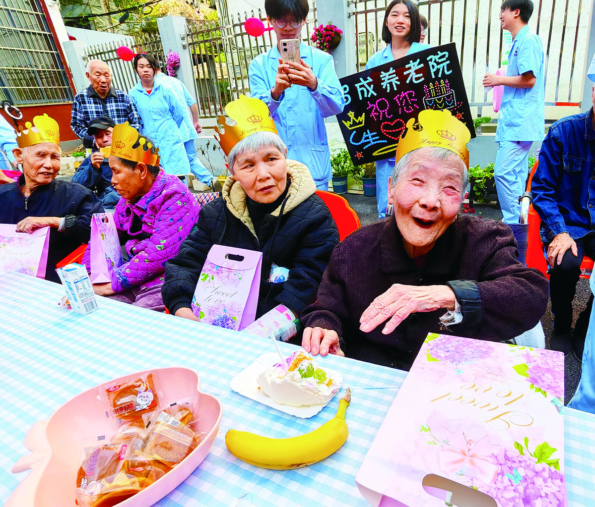 气球、蛋糕、美食、音乐……现场氛围感十足,当易利君老人在医护人员的陪伴下步入会场,响起了热烈的掌声和欢呼声。易利君和其他长者们身着喜庆的衣服,脸上始终洋溢着笑容,整个养老院都沉浸在欢乐与温情的氛围中。