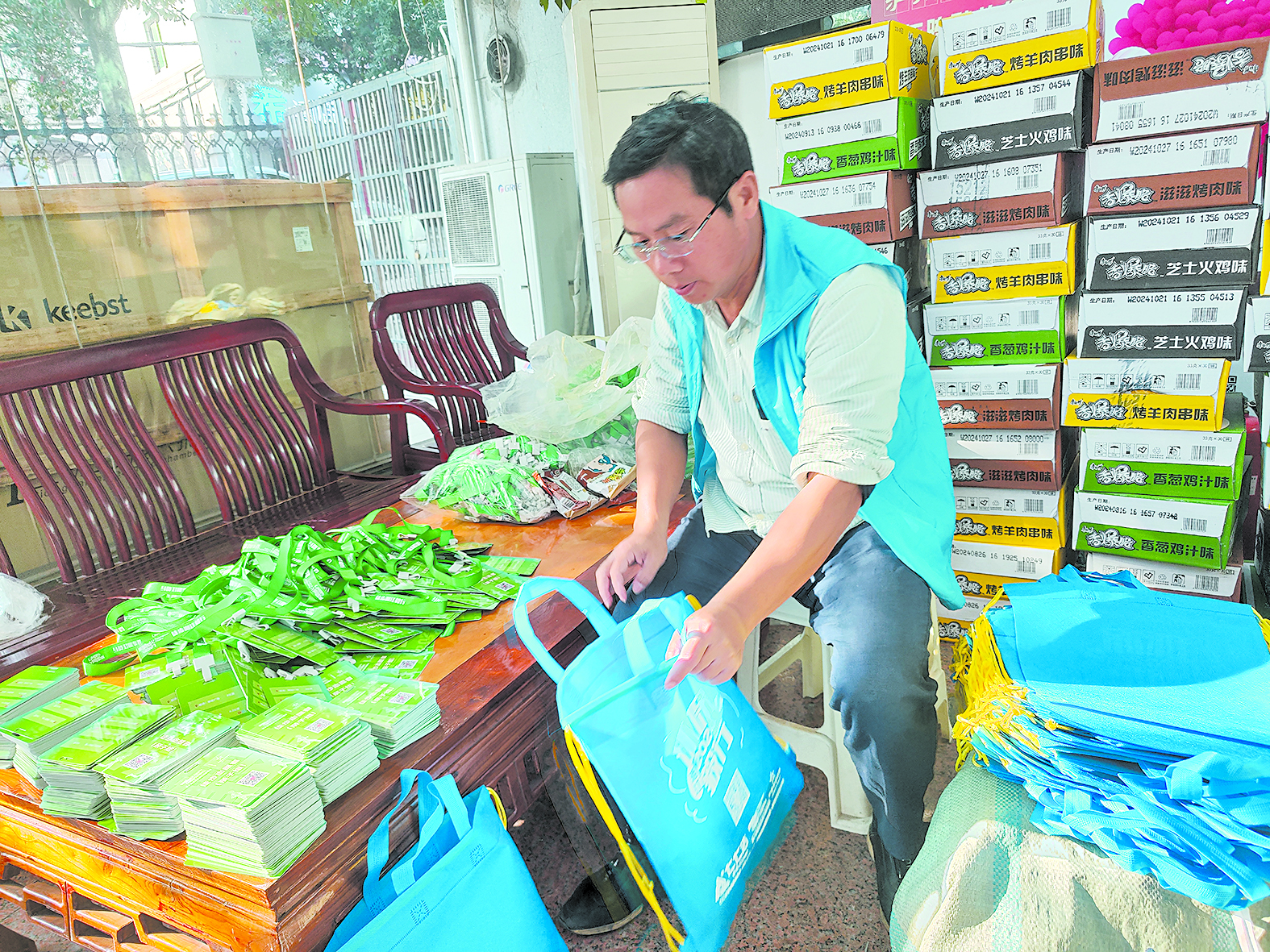 志愿者现场分装物品。 记者/杨凌凌 摄