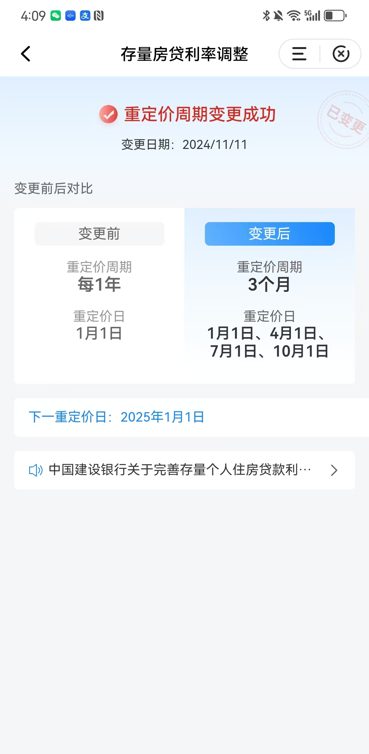 “我已经申请将房贷利率重定价周期从1年调整为3个月,希望能尽早享受到房贷调整的红利。”自从得知存量房贷利率调整政策,家住天元区的李先生一直密切关注,并向银行咨询着最新的进展。11月11日下午,李先生通过建设银行电子银行将重新定价周期成功调整为3个月。