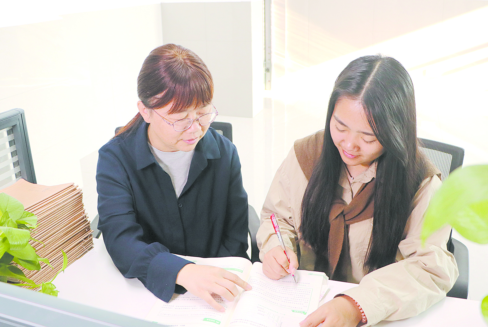 吴兰(左)为学生指导功课。 记者/戴凛 摄