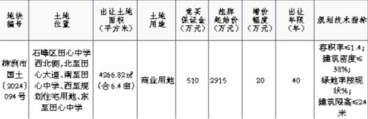 七、本次网上挂牌出让的详细资料和具体要求,见《株洲市网上挂牌出让国有建设用地使用权规则》、《株洲市国有建设用地使用权网上出让系统操作说明》和《株洲市国有建设用地使用权网上挂牌出让须知》等文件,有意竞买者可登录株洲市公共资源交易平台******查询。申请人可于2024年11月18日至2024年12月16日,在网上浏览或下载本次挂牌出让文件,并按上述文件规定的操作程序参加竞买。