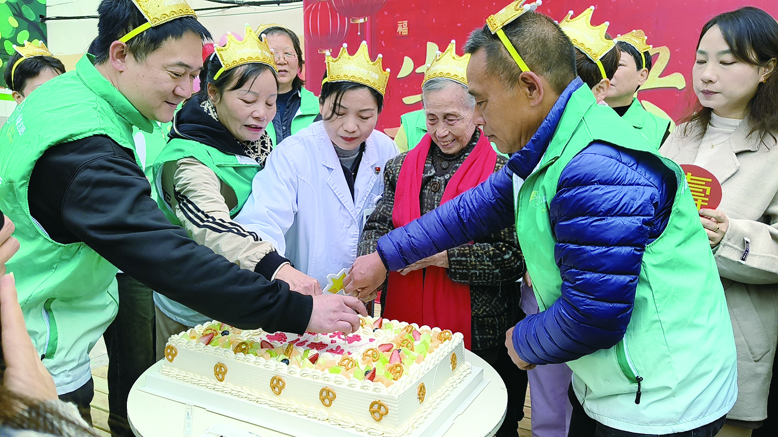 生日会上,沙娭毑和志愿者一起插生日蜡烛。 通讯员/供图