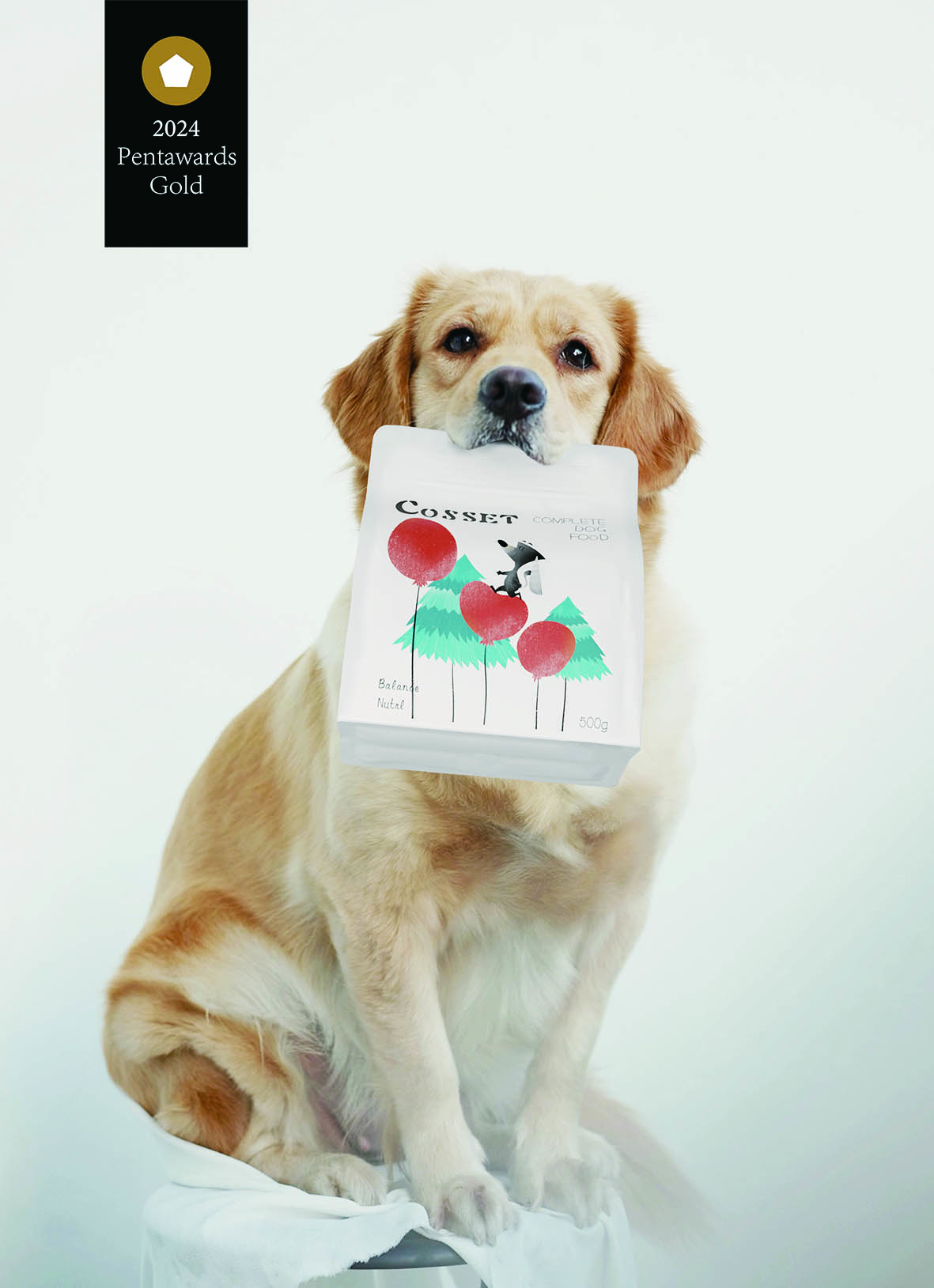 在袋装狗粮上,他们也有自己的巧思。以小狗向往的森林为背景,前景为3个红气球,小狗踩着的红气球略有凹陷,成为一颗爱心。