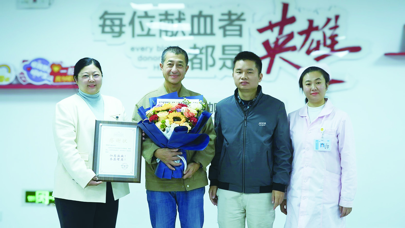 冯俭(左二)最后一次献血后收到鲜花。受访者供图