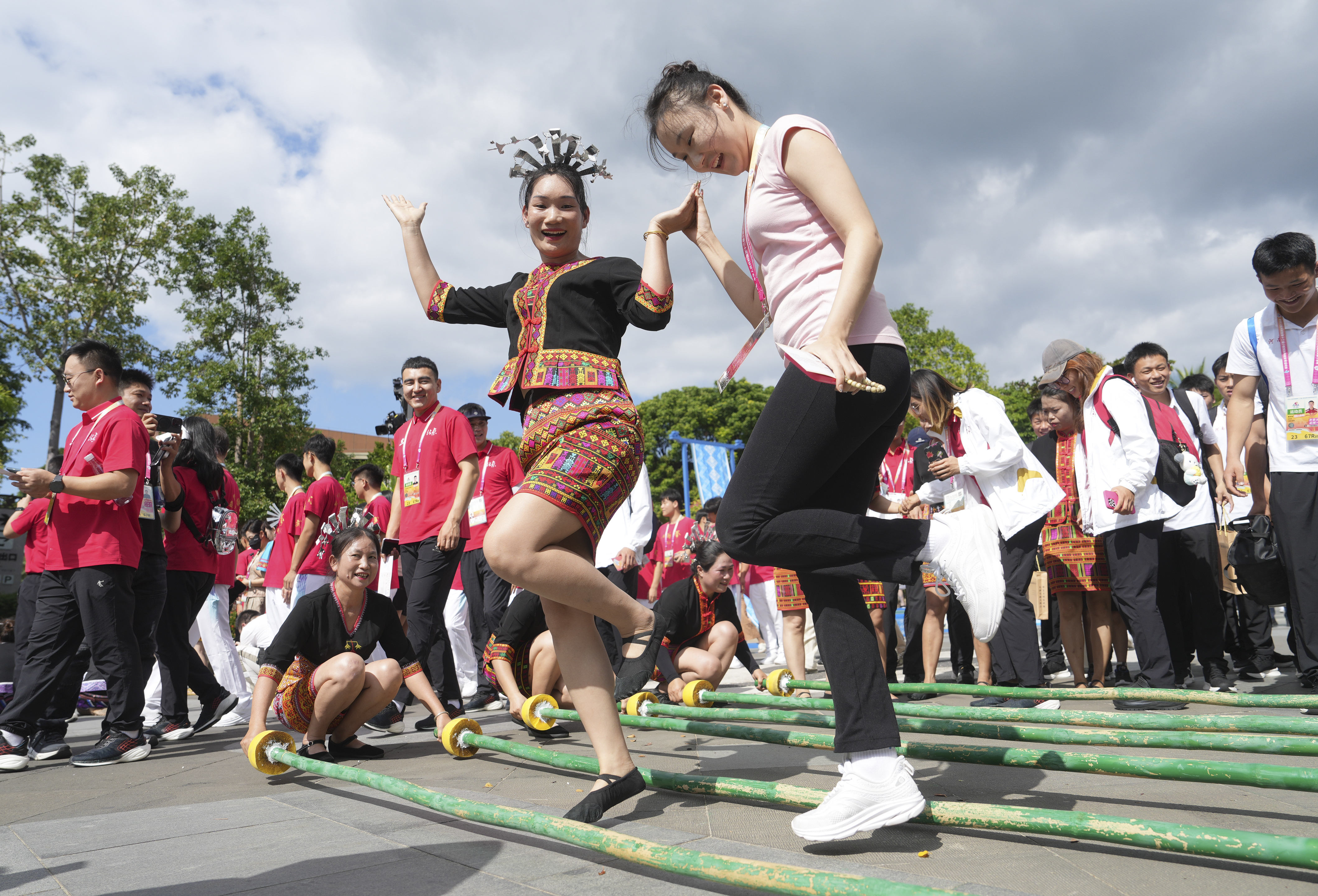 11月26日下午,第十二届全国少数民族传统体育运动会民族大联欢活动在海南省三亚市举行。本届运动会,湖南代表团共有340名运动员参加珍珠球、民族式摔跤、蹴球、民族健身操、龙舟、独竹漂、花炮17个竞赛项目和7个表演项目的比赛(除民族马术项目外,其余项目全部参加)。图为演员和代表团成员在民族大联欢活动中。
