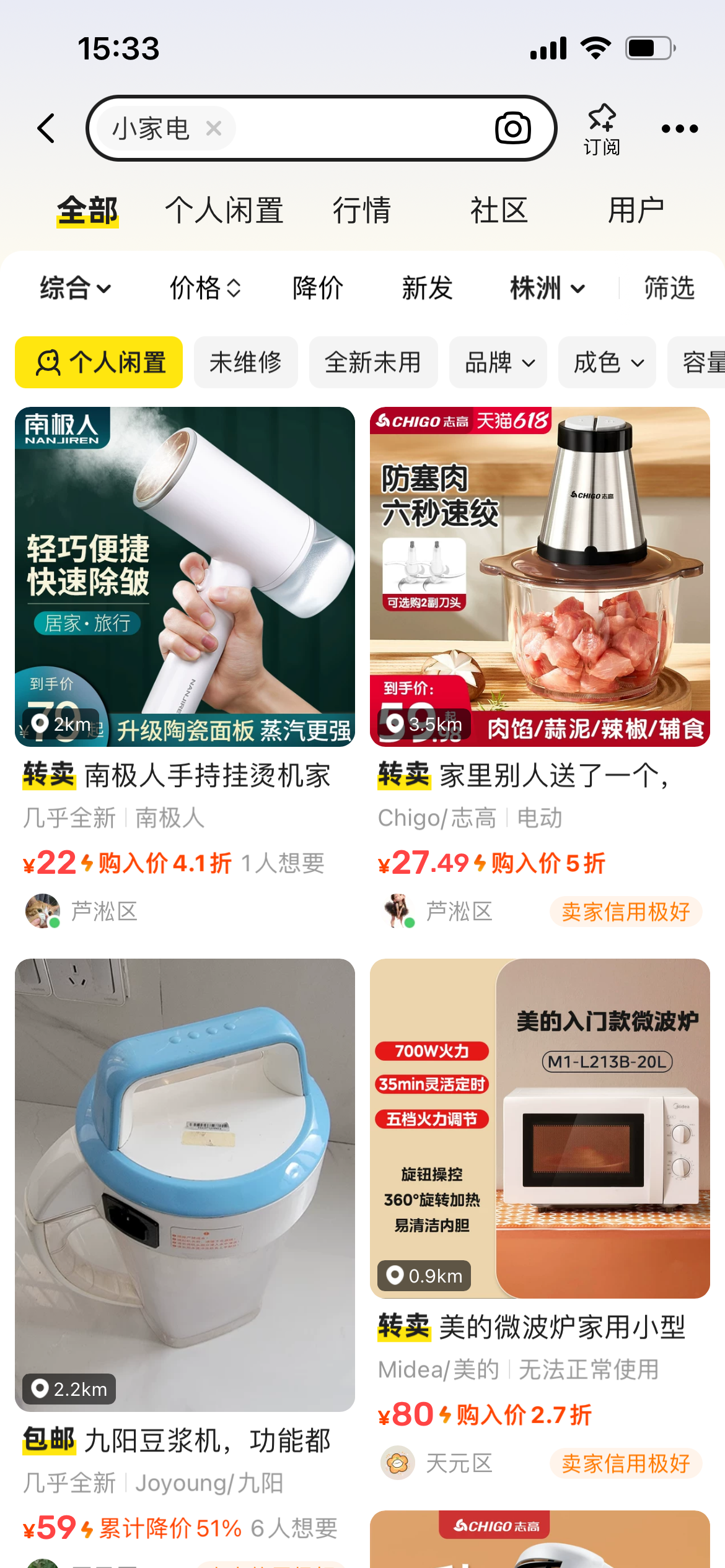 记者在某二手商品平台搜索小家电发现,闲置待转手的小家电数量很多,且价格打折力度很大,有的甚至是原价的一两折。比如,一台全新的空气炸锅,原价368元,二手平台上报价仅120元。