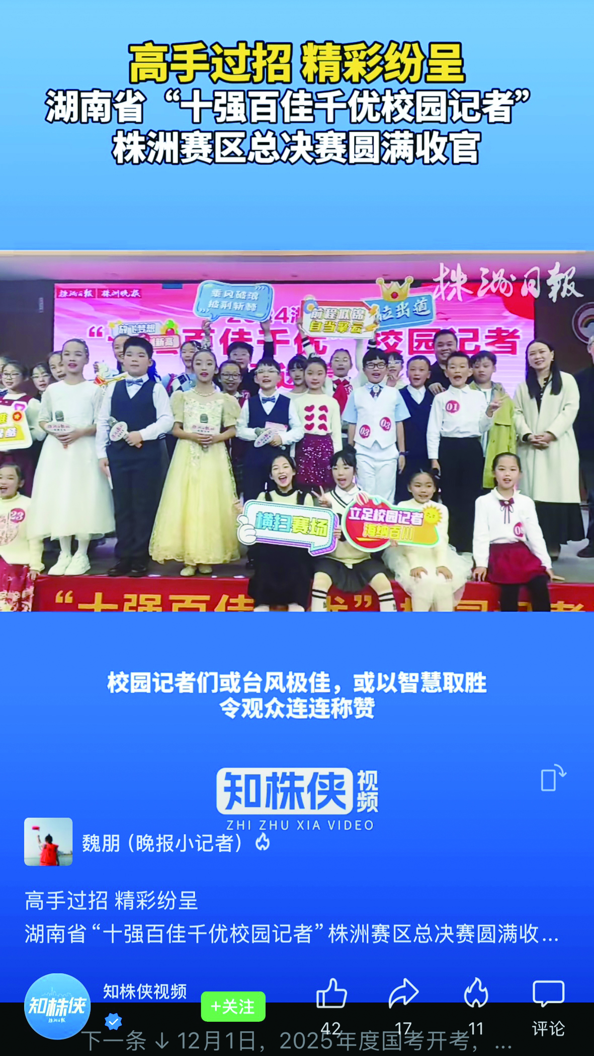 湖南省“十强百佳千优校园记者”株洲赛区总决赛圆满收官。该活动从同龄孩子中评选出成绩优异、品行高尚、文字功底深厚、活动能力出众、才艺过人的校园记者代表。