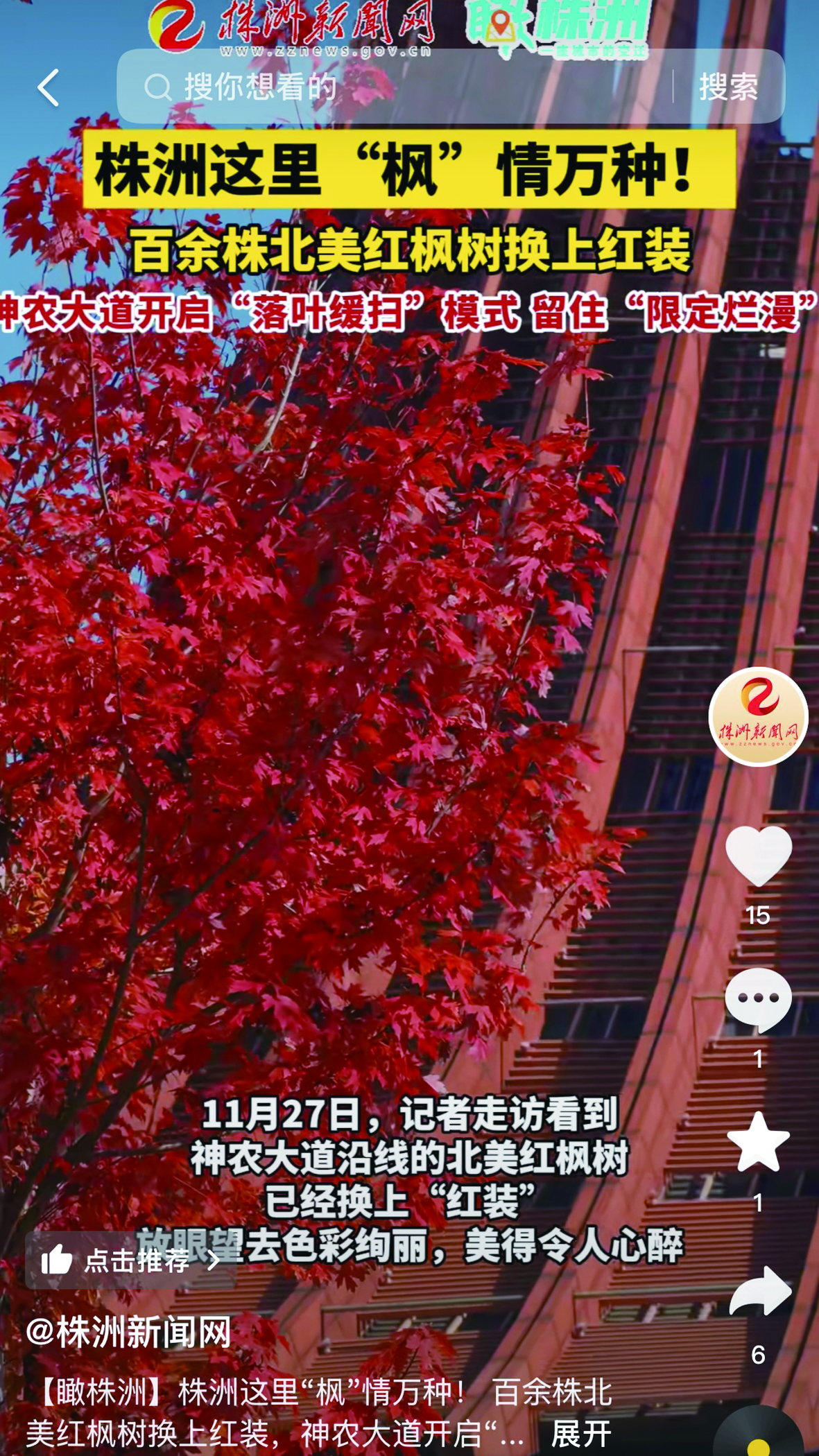 眼下,株洲大街小巷、公园广场,众多树种被渲染成缤纷的色彩,神农大道沿线的百余株北美红枫树叶已经换上“红装”,色彩绚丽,令人心醉。