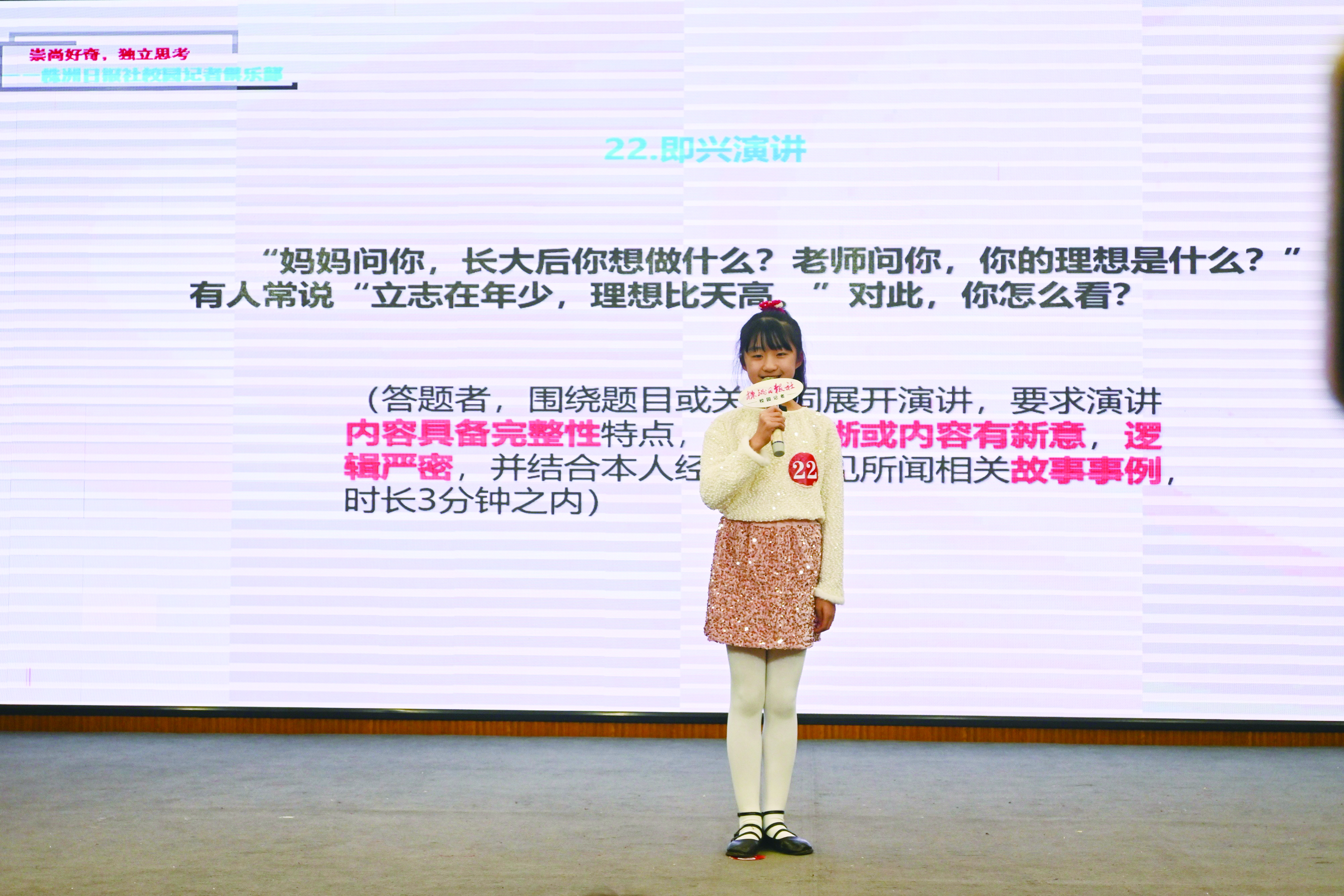 “如果你穿越到了古代,来到苏轼面前,你会对他说什么?”“小学生如果不上文化补习班,你觉得成绩会下滑吗?”……比赛即兴演讲环节,面对现场的评委、观众,舞台上的校园记者们一个个自信满满,声音洪亮,结合自己学习生活的经历,充分表达出了自己的观点和见解。现场掌声不断,但是,让大家印象最深的还是校园记者的语言表达能力和现场应变能力。