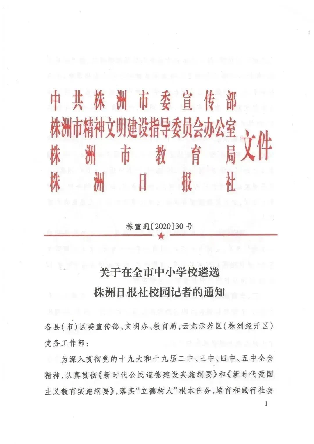 ▲《关于在全市中小学校遴选株洲日报社校园记者的通知》株宣通【2020】30号文件精神要求,在全市中小学校开展校园记者遴选工作。