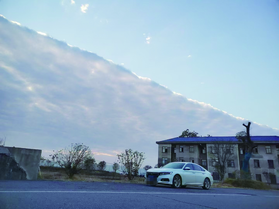 12月3日清晨,因气温变幻,攸县鸭塘铺中学天空出现“泾渭分明”的云墙景观。白色云层将天空一分为二,一边是密布的云层,一边是清透的晴空,颇为壮观。该云层是高积云,俗称“阴阳天”,一般是因为干冷气流和暖湿气流交汇而形成。