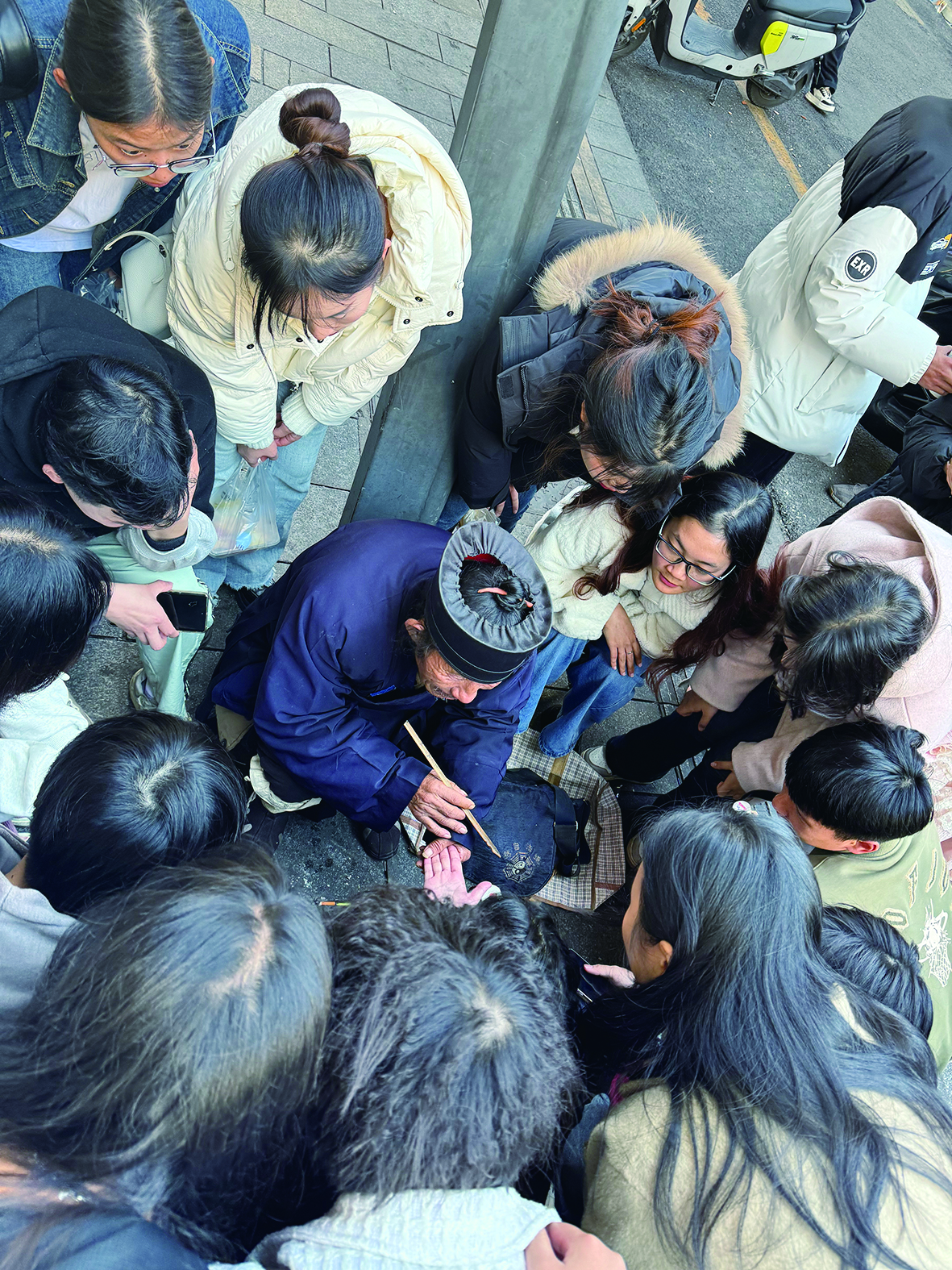 12月1日下午2时许,钟鼓岭街上人来人往,热闹非凡。在这样一个熙熙攘攘的街道角落,一位身着道袍的老者吸引了众人的目光。他随地而坐,身边敞开的布包里装满了卦杯、竹签等算命工具。一群好奇的年轻人围绕着他,他们的目光中闪烁着对未知的渴望。