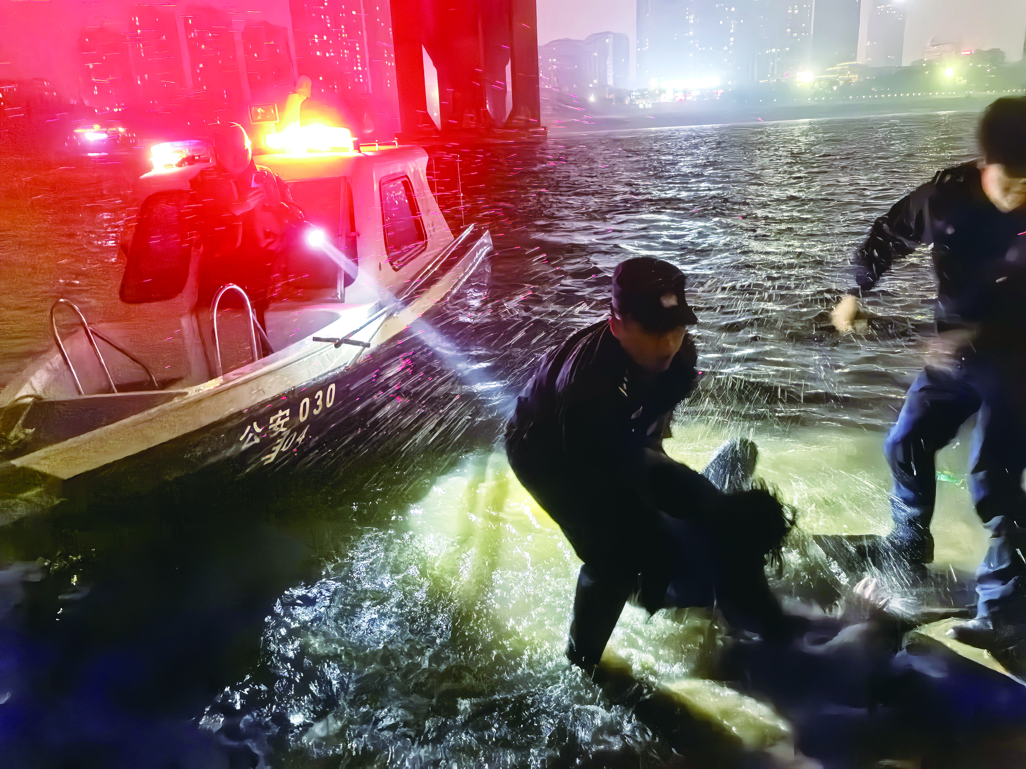 确认男子的位置后,庆云派出所民警杨啸仁、建宁派出所民警兰嗣昊跳入冰冷的江水中,合力将男子拖到岸边,岸上其他民辅警一起将他们3人拉上岸。