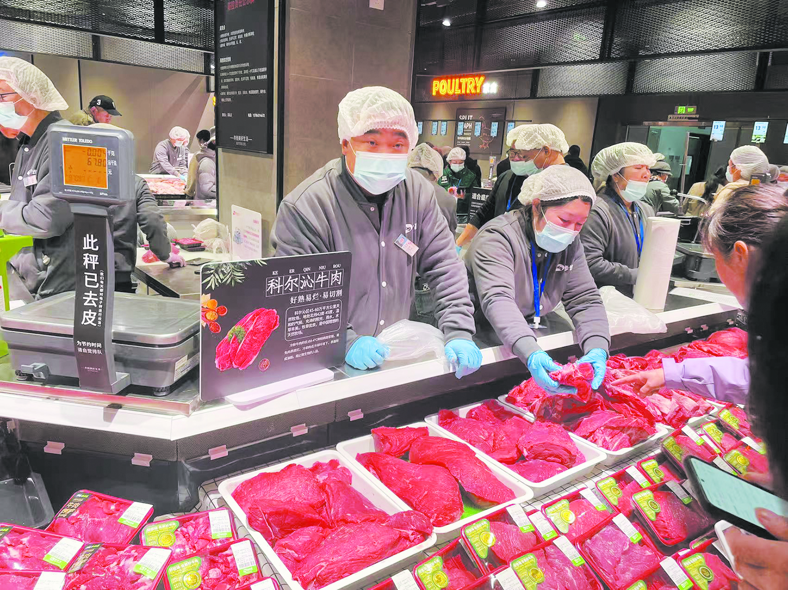 超市肉类区域,顾客正在选购。记者/任远 摄