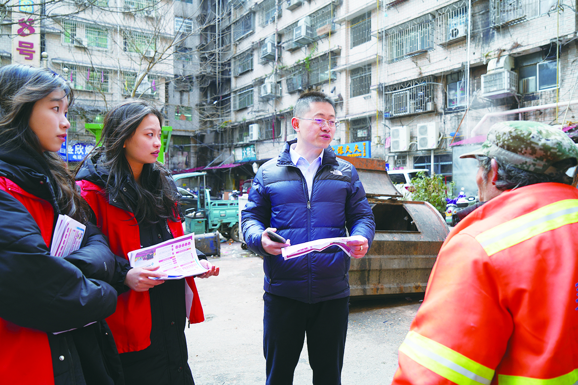 谭阳希(左三)带领学生进社区开展法治宣传实践课。 记者/戴凛 摄