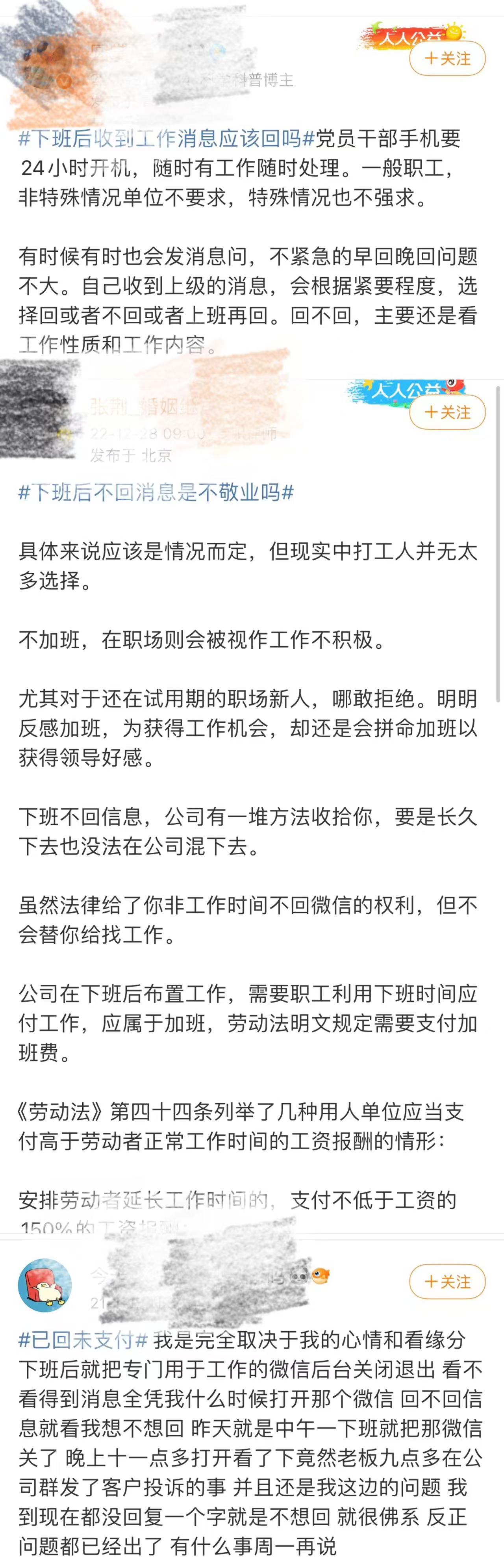 针对此次网上发酵的“已读不回”事件,在匿名的评论区,网友们可就一边倒了,“晚上10时他还好意思发信息?”“你想大家回复的话,先付个加班费呗”……诸如此类的评论,显然大家都对下班后仍会收到工作信息,有太多不满。