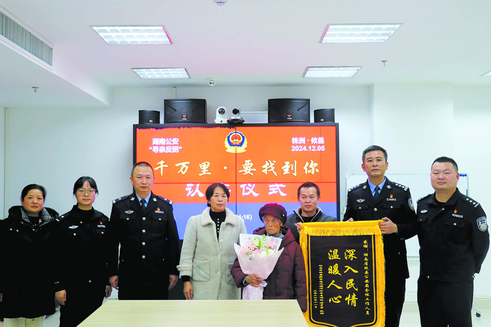 12月5日,民警带着文某英老人平安返回攸县。攸县公安局刑侦大队为文某英老人和付先生一家举行了认亲仪式。摄像机镜头和闪光灯让文某英老人略显紧张,付先生见状紧紧握住她的手说道:“妈!别怕,有我在,这次我不会再松手了!”