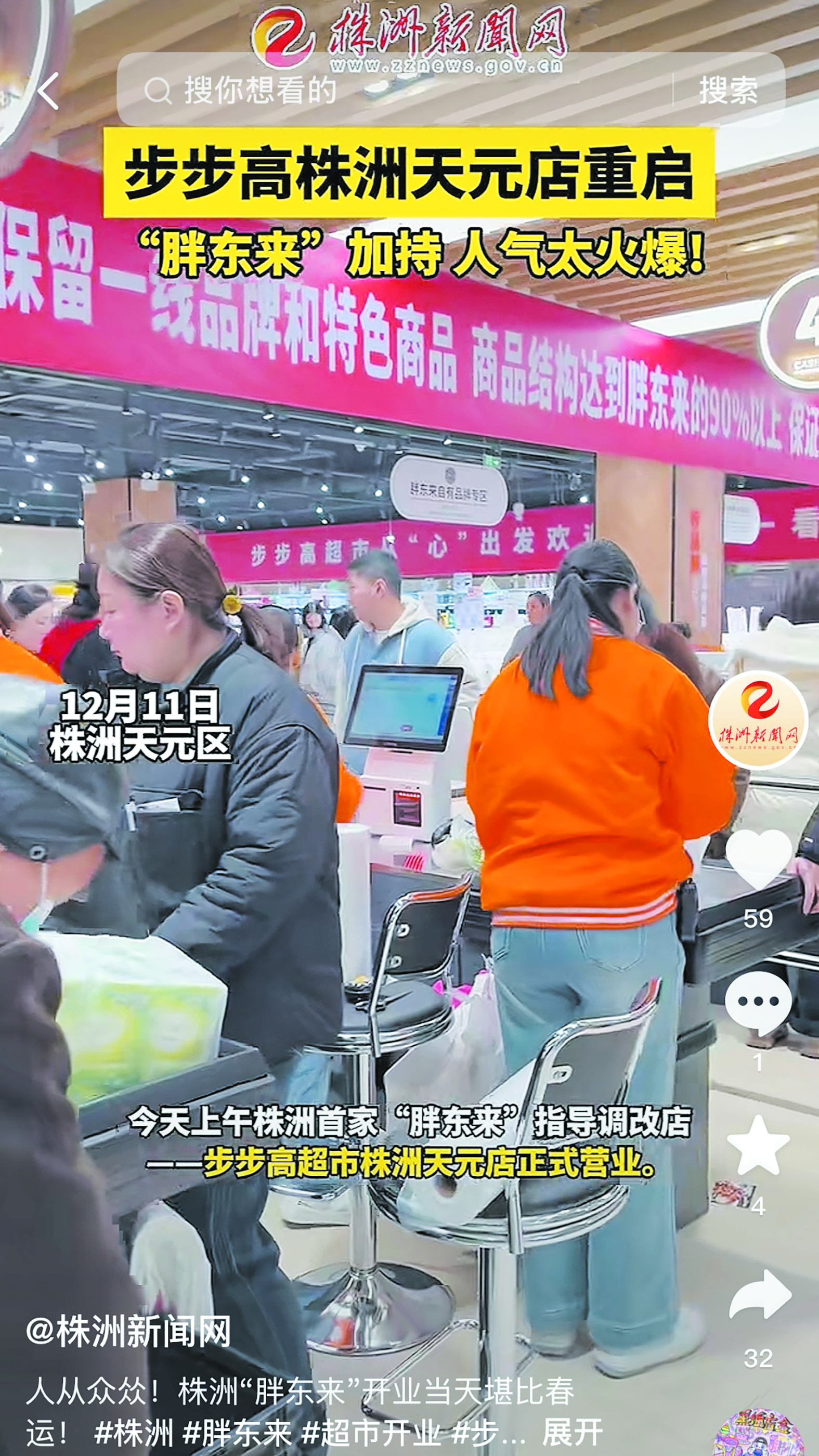 12月11日,经过43天闭店调改,步步高超市天元店升级开业,作为“胖东来”调改的株洲首店,开业现场非常火爆。