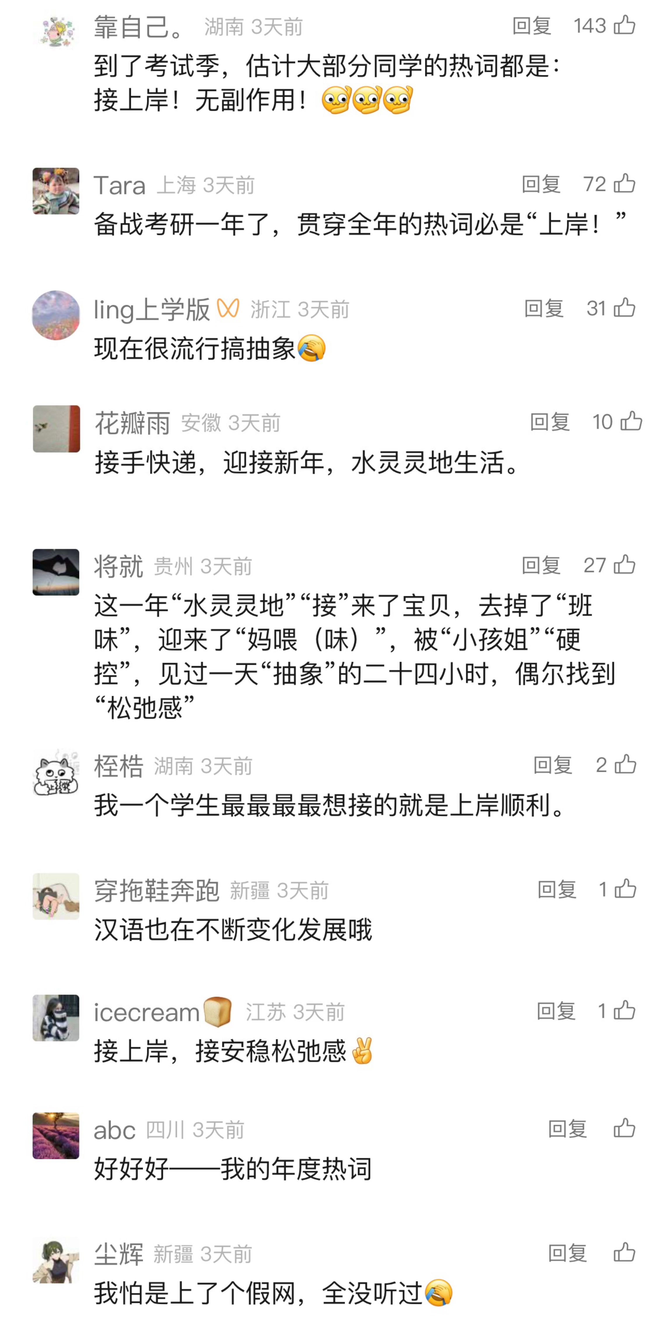对于大四的小王来说,他心里的年度热词是“接”。这个词汇对他来说,是对未来的期待和对好运的祈愿。小王说:“面对明年的毕业和就业,我感到既兴奋又紧张。每次在平台上看到‘接’字弹幕,我都会默默许下愿望,希望能找到满意的工作。”