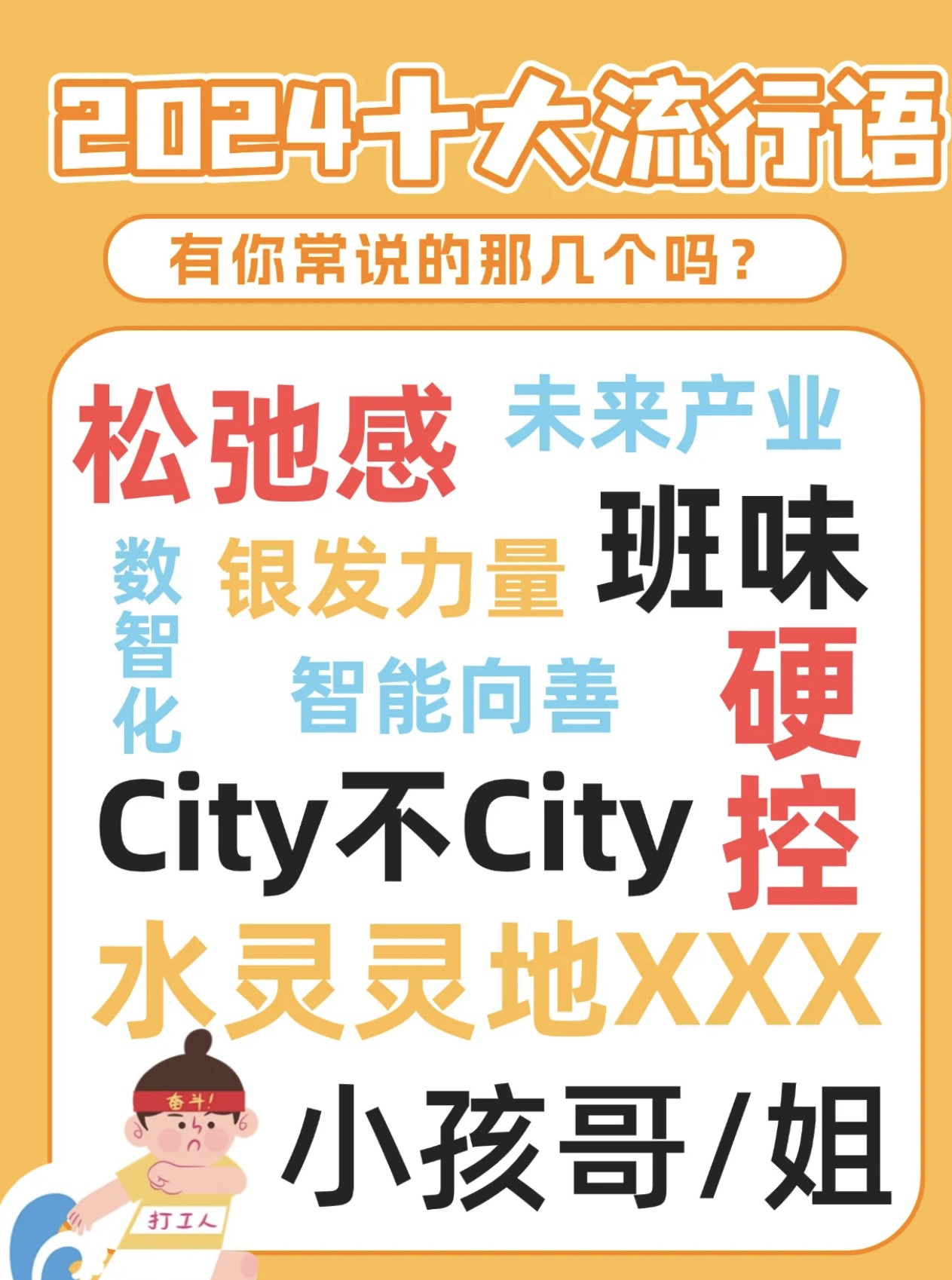 《咬文嚼字》公布2024年十大流行语,包括数智化、智能向善、未来产业、city不city、硬控、水灵灵地、班味、松弛感、银发力量、小孩哥/小孩姐等。