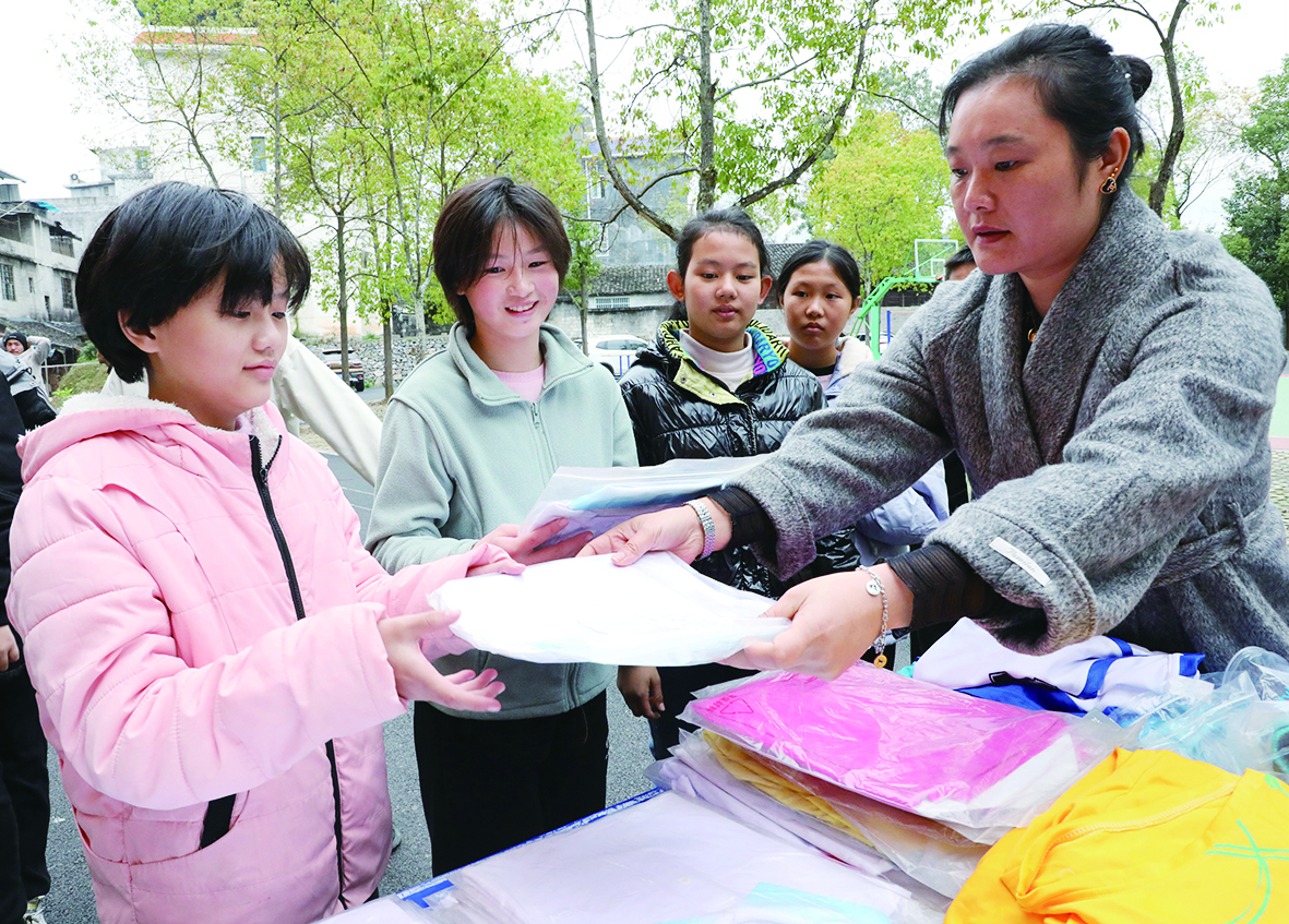 近日,在湘西土家族苗族自治州保靖县清水坪学校,来自荷塘区星河小学支教老师钟薇为学生发放爱心物资。