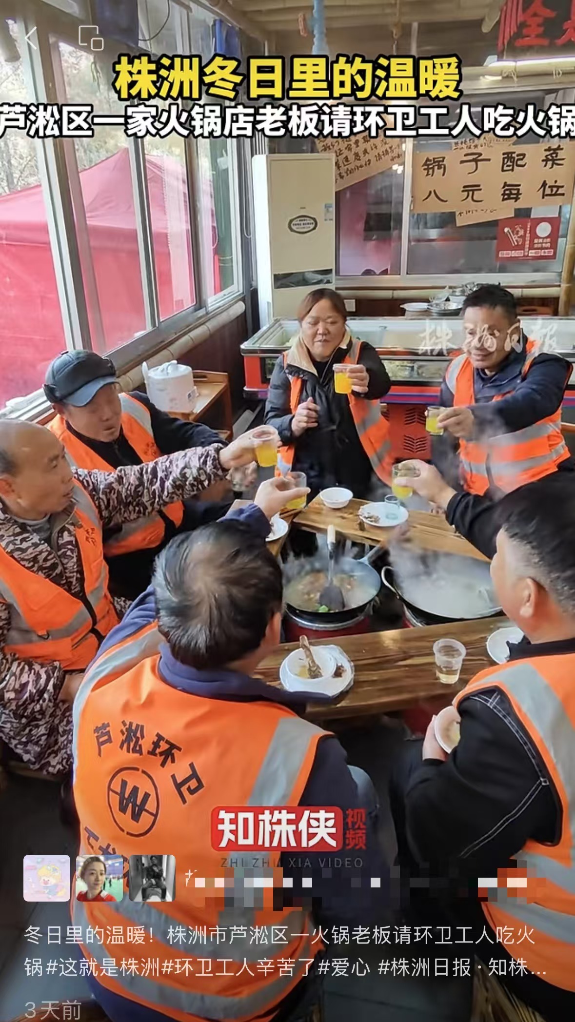 环卫工人辛苦了!芦淞区一家火锅老板请环卫工人吃火锅以表敬意谢意,也呼吁更多市民尊重劳动者及他们的劳动成果。