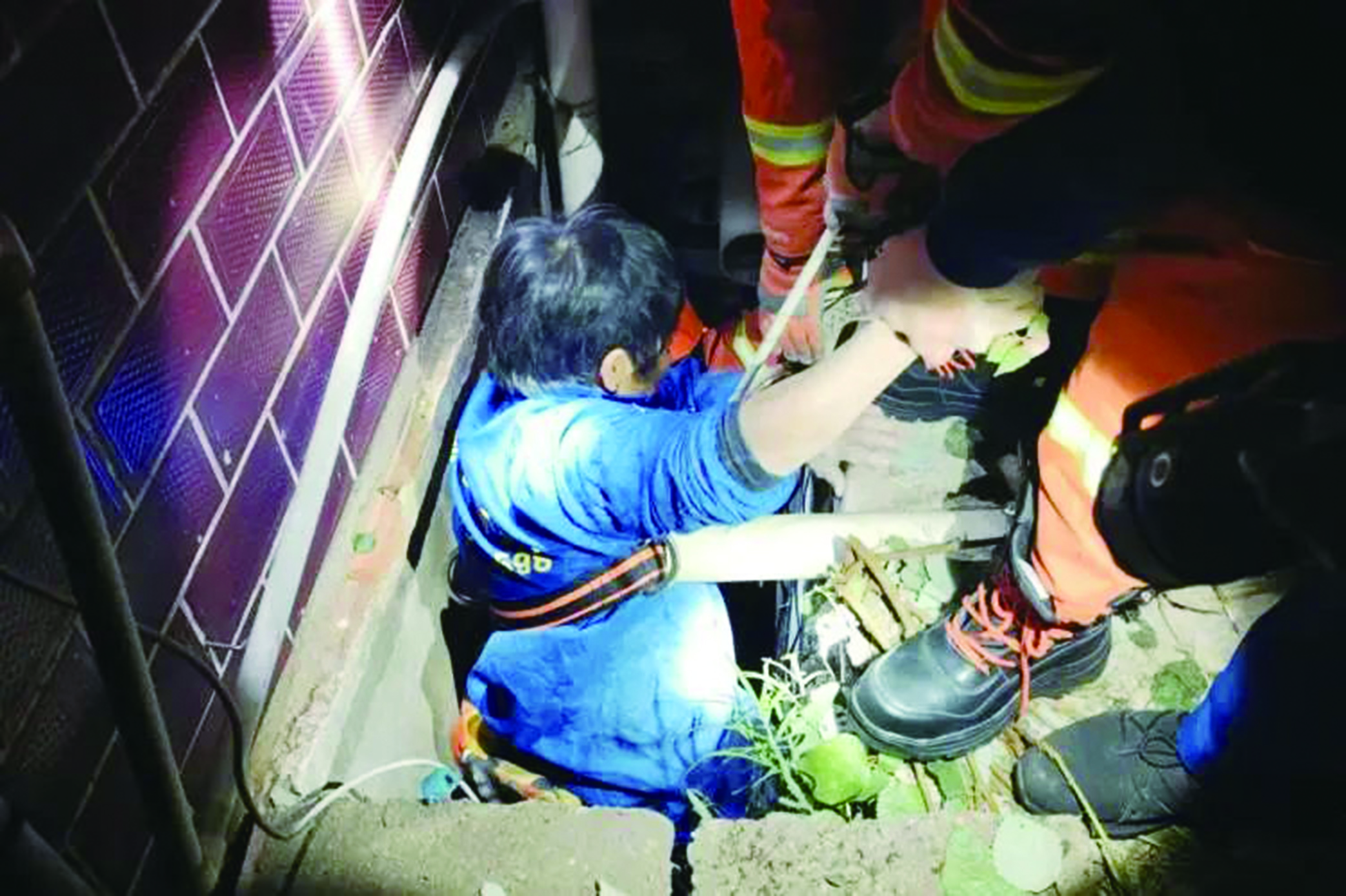 消防队员抵达现场后发现,老人所处位置距离地面高达4米左右,狭窄的墙缝让老人无法自行攀爬梯子回到地面。面对这一棘手情况,消防员们迅速制定救援方案。一名消防员携带腰带,小心翼翼地攀至老人身边,为其系上安全绳,随后地面上的其他消防队员齐心协力,通过操控安全绳,缓缓地将老人拉至地面,成功完成救援任务。