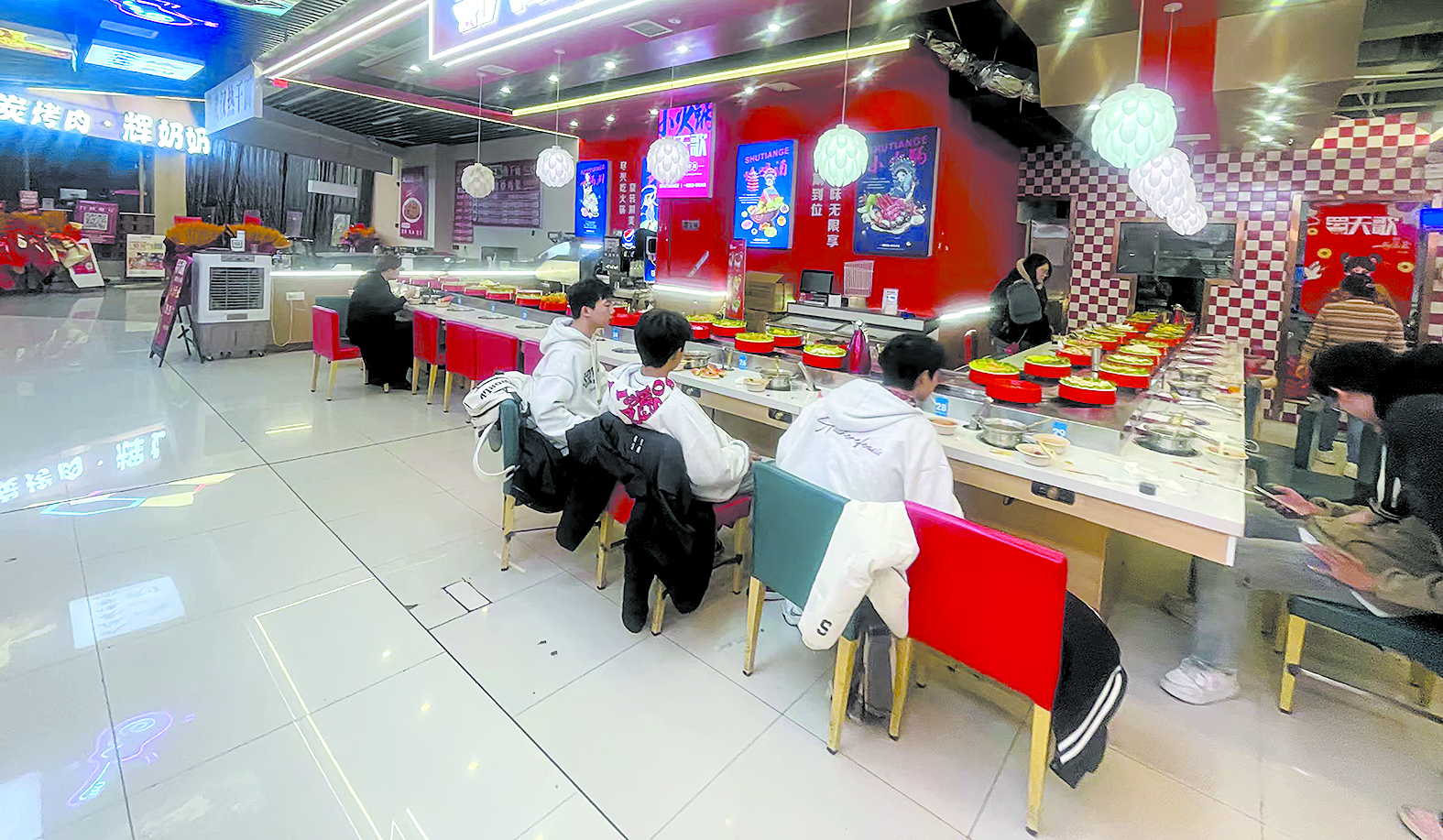 12月26日下午3点,虽然早已过了午饭时段,但位于芦淞区的一家自助小火锅店内,仍然有6位顾客就餐。他们每个人的座位前对应一口小火锅,餐桌上方是自助餐盘轨道,热气腾腾的火锅香气四溢。